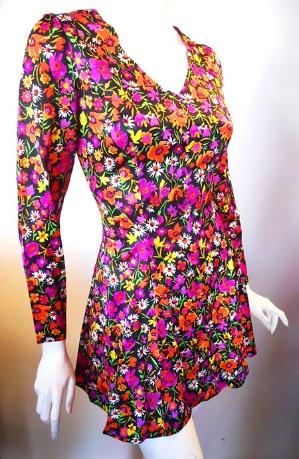 | Bright poppies and wildflowers adorn this black poly jersey 70s mini dress with flared skirt. Vinyl zip up back...no label, no flaws. Click picture for more images. 36" bust, 26" waist, 42" hips, 35" long, 23" sleeves $125 |