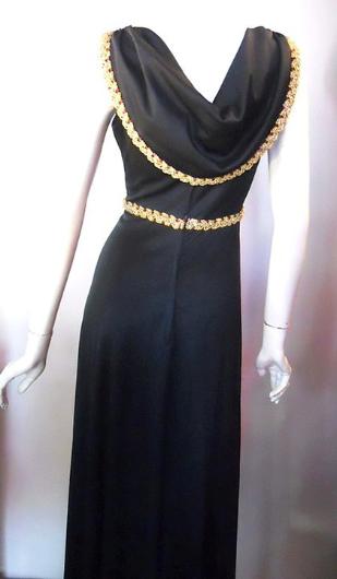 | COMING SOON..... Black poly jersey 70s maxi dress with cowl back drape and gold/red metallic braid trim. Watch for details. |