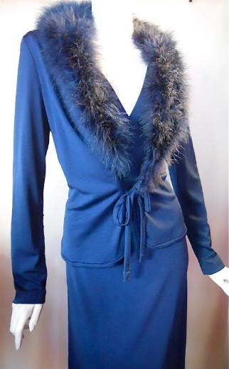 | Deep midnight blue jersey poly 70s gown and marabou trimmed jacket by Miss Elliette. No flaws. Click picture for more images. 42" bust, 32" waist, 44" hips (max measurements stretched), 58" long $215 |