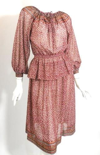 | 1970s sheer crepe jersey nylon 2 piece floral dress in autumnal tones. Blouson top with elastic waist, drawstring neckline. Elastic waist skirt. Unlined, no flaws. Top measures 40" bust, 30" waist (max), 24" long, 22" sleeves Skirt~ 28-30" waist, 44" hips, 27" long $125 |