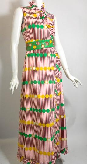 | 70s maxi length wrap dress in red and white striped with candy dots in bright green, white and yellow. Matching vinyl belt snaps shut, embroidered with striped and solid dots. Ruffled around neckline and down front, snaps shut inside. No flaws. Click picture for more images. 37" bust, 27" waist, 42" hips, 57" long $145 |