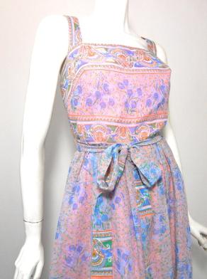 | 70s pastel floral print Miss Elliette sundress with sash. Voile cotton over heavier cotton, zips up back. No flaws. Click picture for more images. 38" bust, 28" waist, 42" hips, 16" bodice, 41" long $155 |