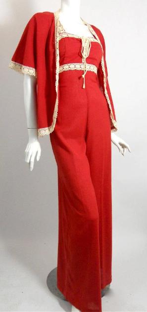 | Red crepe cotton 70s jumpsuit with palazzo wide legs, lace trim and jacket. Sleeveless bodice on jumpsuit, corset lace center bust. Labeled "Rags by Kressandra". No flaws. More images to come. Available in black w/ black trim as well! 38" bust, 30" waist, 42" hips, 57" long $165 |