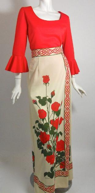 | 70s two piece maxi dress by Alfred Shaheen. Red polyester knit top with bell ruffle sleeves, scoop neck. Maxi skirt with Asian inspired border print, bright roses up front. More details to come. $125 |