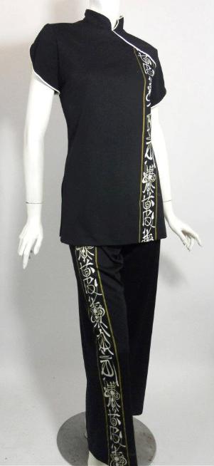 | Black jersey nylon 2 piece Asian inspired set by Alfred Shaheen. Cheongsam top with white and gold print, elastic waist pants with print down right leg. No flaws. More images to come. 38" bust, 30" waist, 42" hips $190 |