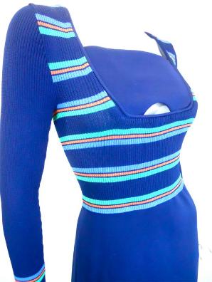| Deep blue poly space age early 70s maxi dress with ribbed bodice. Stripes of melon and turquoise on ribbed part of bodice, inset at bust with solid blue poly cut out at center. No label, no flaws. 36" bust, 26" waist, 42" hips, 23" sleeves, 57" long $275 |