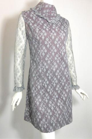 | Dusky blue and violet lace and taffeta 70s mini dress by Young Edwardian. Sheer sleeves, lace overlay over pale violet acetate taffeta...high bibbed neckline. Vinyl zip up back. No flaws, more images to come. 36" bust, 30" waist, 39" hips, 36" long, 23" sleeves $135 |