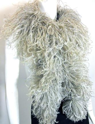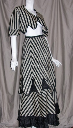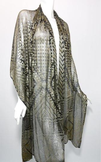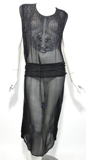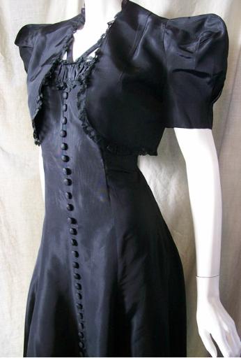 | Sheer black organza overdress with ruffled shoulder and train, circa 1930s. No label. |