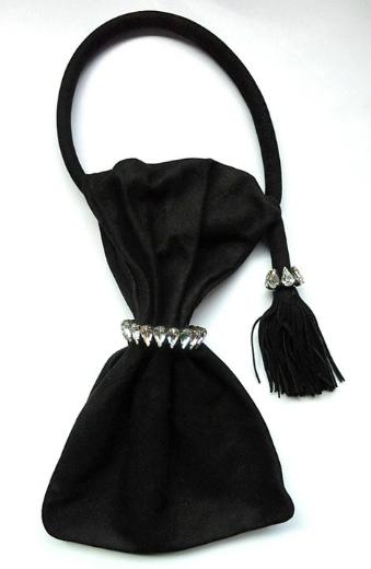 | 1940s miser's bag inspired evening bag in black deerskin suede with rhinestone slide ring and fob |