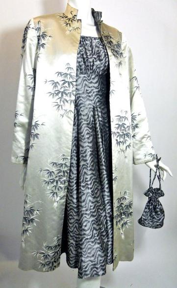 | 1960s silver and black party dress with reverisble coat, 2 bags. |