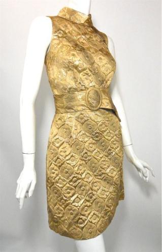 | Demure & elegant silk 50's dress by MOLLIE PARNIS. Thistle motif woven into fine silk, rhinestone buttons, self belt. |