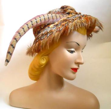 | 60s hat with shallow crown and downturned brim covered in gorgeous feathers, accented with a pheasant feather plume. No flaws, size 22. $75 |