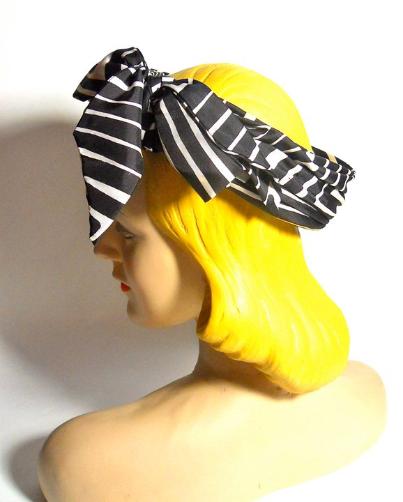 | Sally Victor 60s ring shaped hat in black and white striped silk, big bow in front. Sz 22, no flaws. $80 |
