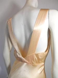 | Dreamy sweet peach satin acetate late 30s bias cut nightgown with trapunto stitching. Mother of pearl buttons at center of sweetheart neckline, shirred at shoulders....ruffle sleeves. Sashes at side seams tie in back. No flaws, from the SPENCER COMMUNITY THEATRE COLLECTION. 40" bust, 30" waist, 44" hips, 57" long $195 |