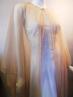 | Peach chiffon and lace 1950s nightie. Satin ribbon tiered waist with V tab and tails....by Vanity Fair, sz 34. No flaws. $95 |