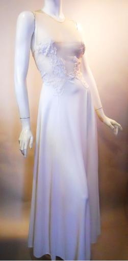 | Elegant and subtly sexy 60s nightgown in snow white soft nylon and strategically placed white lace with sheer nude deep V neckline and plunging back. Nude chiffon "float" robe with rhinestone button at neckline. By "FormFit Rogers", size 18. A few places where chiffon has come unrolled at neckline of float, no holes or stains....breathtaking! 42" bust, 32" waist, 54" hips, 58" long $225 |