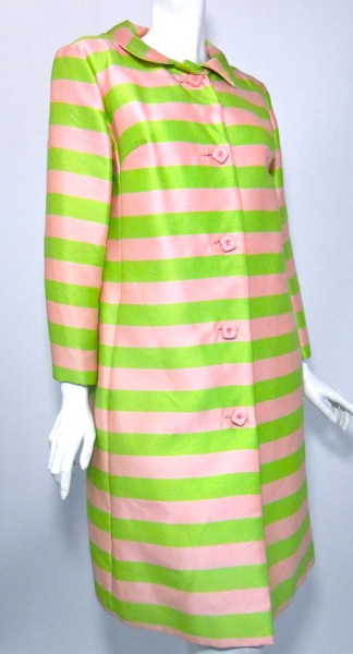 | Rose pink and mint green horizontal striped ssilk pring coat from the 1960s. Chunky mod pink buttons, fully lined. No flaws. Click picture for more images. 40" bust, 42" waist, 44" hips, 40" long, 20" sleeves $200 |