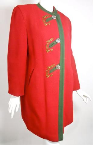 | 1960s red poplin Bonnie Cashin coat with tan accents. Signature toggle closures. No flaws, appears never worn. 40" bust, 40" waist, 44" hips, 42" long $200 |