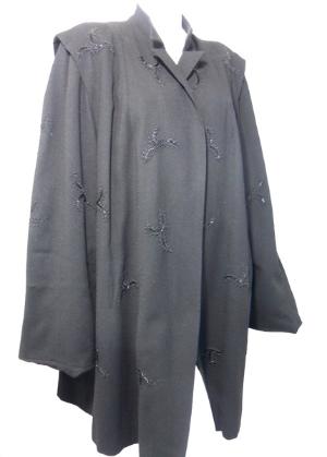 | Gorgeous jet black wool coat from the 1940s with bead and soutache detail (picture lightened to show details, is true black in real life). Wide pleated shoulders, fully lined in silk. From Marshall Field and Co....a great larger size! From the SPENCER COMMUNITY THEATRE collection. Click picture for more images. 50" bust, 58" waist, 64" hips, 38" long, 24" sleeves $450 |