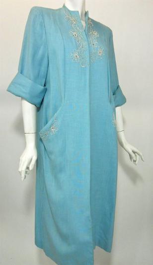 | 50s aqua blue linen weave rayon evening coat (likely part of an ensemble, dress long gone). Soutache, studs and rhinestones adorn bodice toward stand up necline, more trimming hip pockets. Wide cuffs, shoulder pads...no closure (clutch style). No label, no flaws. More images to come. 17" shoulders, 42" bust, 44" waist, 46" hips, 42" long, 18" sleeves $185 |