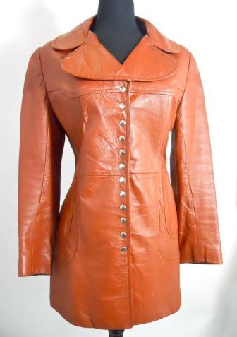 | Late 60s cognac leather jacket with wide, curving lapel. Loads of snaps down the front, half sash buckles in back to nip waist. Click picture for more images. 17" shoulders, 40" bust, 32" waist, 42" hips, 23" sleeeves, 30" long $145 |