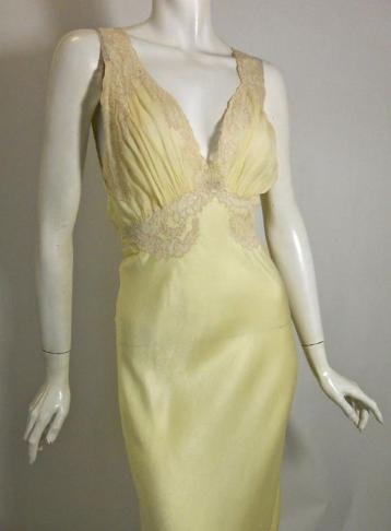 | Pale yellow cool rayon 1950s nightgown by Barbizon. Lace trimmed bodice, double twist straps. No flaws. 40" bust, 32" waist, 44" hips, 57" long $95 |