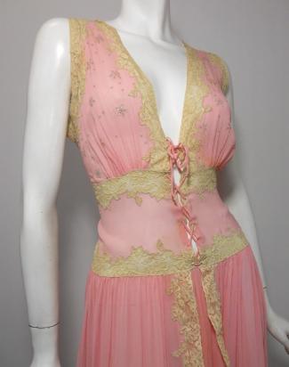 | Stunning pink silk 40s nightgown with ecru lace trim and corset lace center to waist. Lace trimmed skirt and hem. A few water spots, one dark spot on lace toward hem ...barely noticeable. No label. Click picture for more images. 40" bust, 30" waist, 54" hips, 56" long $215 |