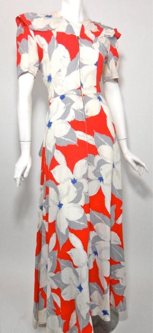 | Bright red plisse 40s zip front dressing gown with white magnolia flowers with blue centers and grey leaves. Half sash ties in back. One dot-spot toward right ankle, no holes. From the Spencer Community Theatre collection. Click picture for more images. 38" bust, 30" waist, 44" hips, 16" bodice, 10" sleeves, 57" long $245 |