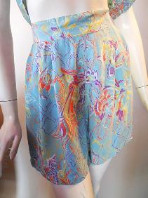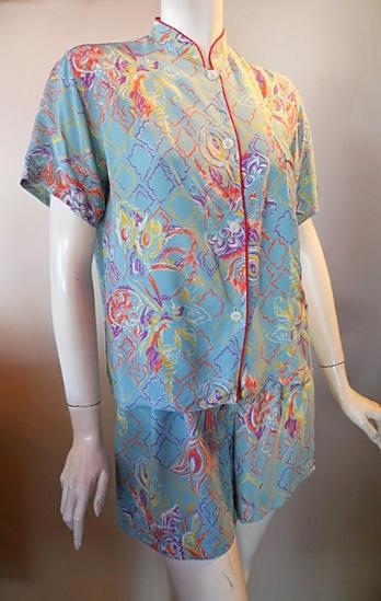 | Fantastic 40s rayon 2 piece shorts pajama set. Aqua background sets off stylized print of Thai warrior with spire helmet and sheild. Piped in red, mandarin collar, left breast pocket. No flaws, no label. Top~ 40" bust, 38" waist, 23" long, 10" sleeves Shorts~ 28" waist, 40" hips, 12" rise, 17" long $175 |