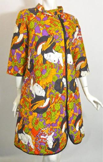 | Fantastic cotton quilted 60s zip front robe with bright Asian print of Geishas. Off center zip with black beveled plastic pull, stand up collar with black button. No label, no flaws. 40" bust, 46" waist, 52" hips, 40" long $135 |