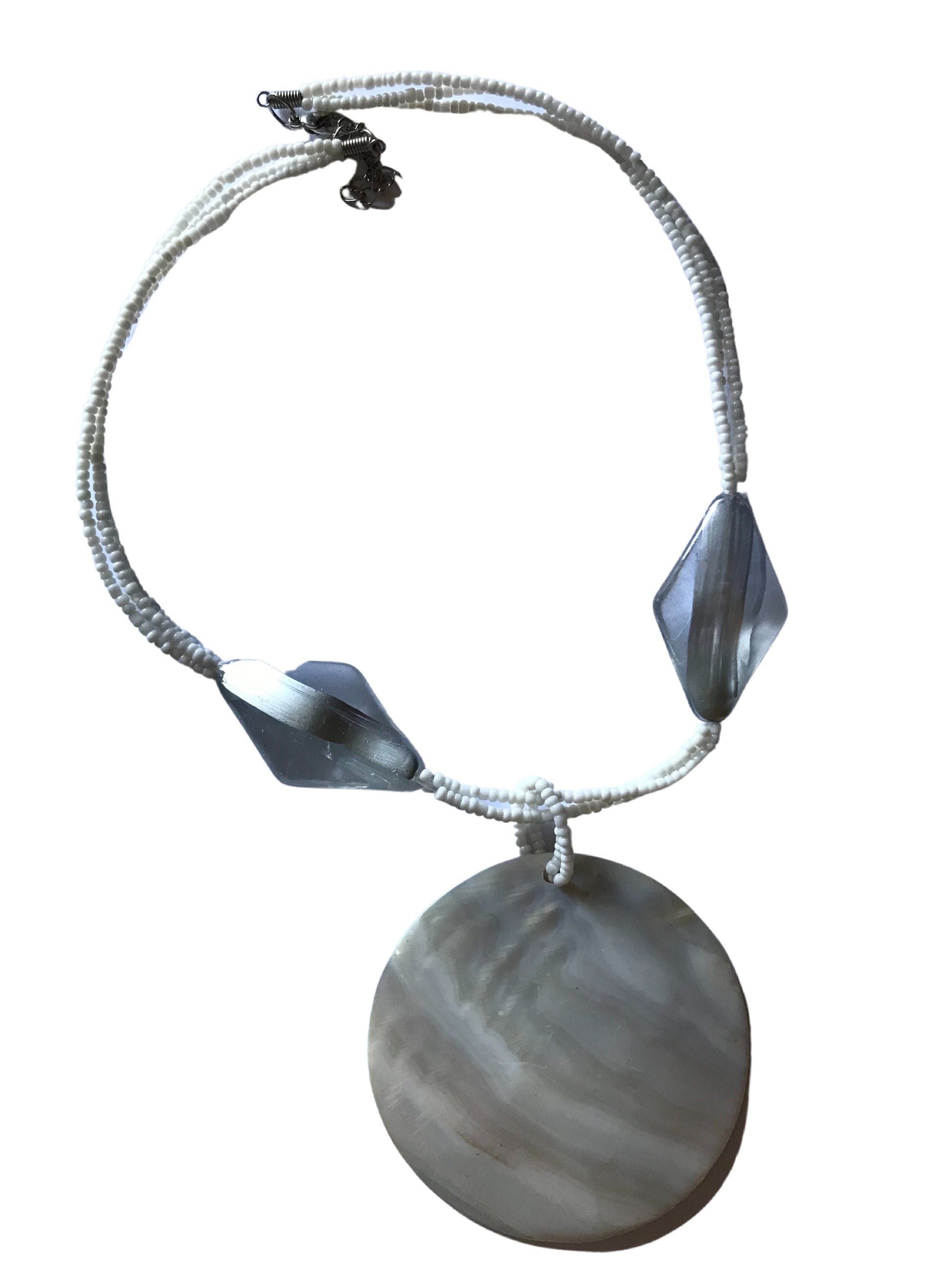 1980s white beaded double strand necklace with lucite beads, huge abalone disc. No maker, no flaws.