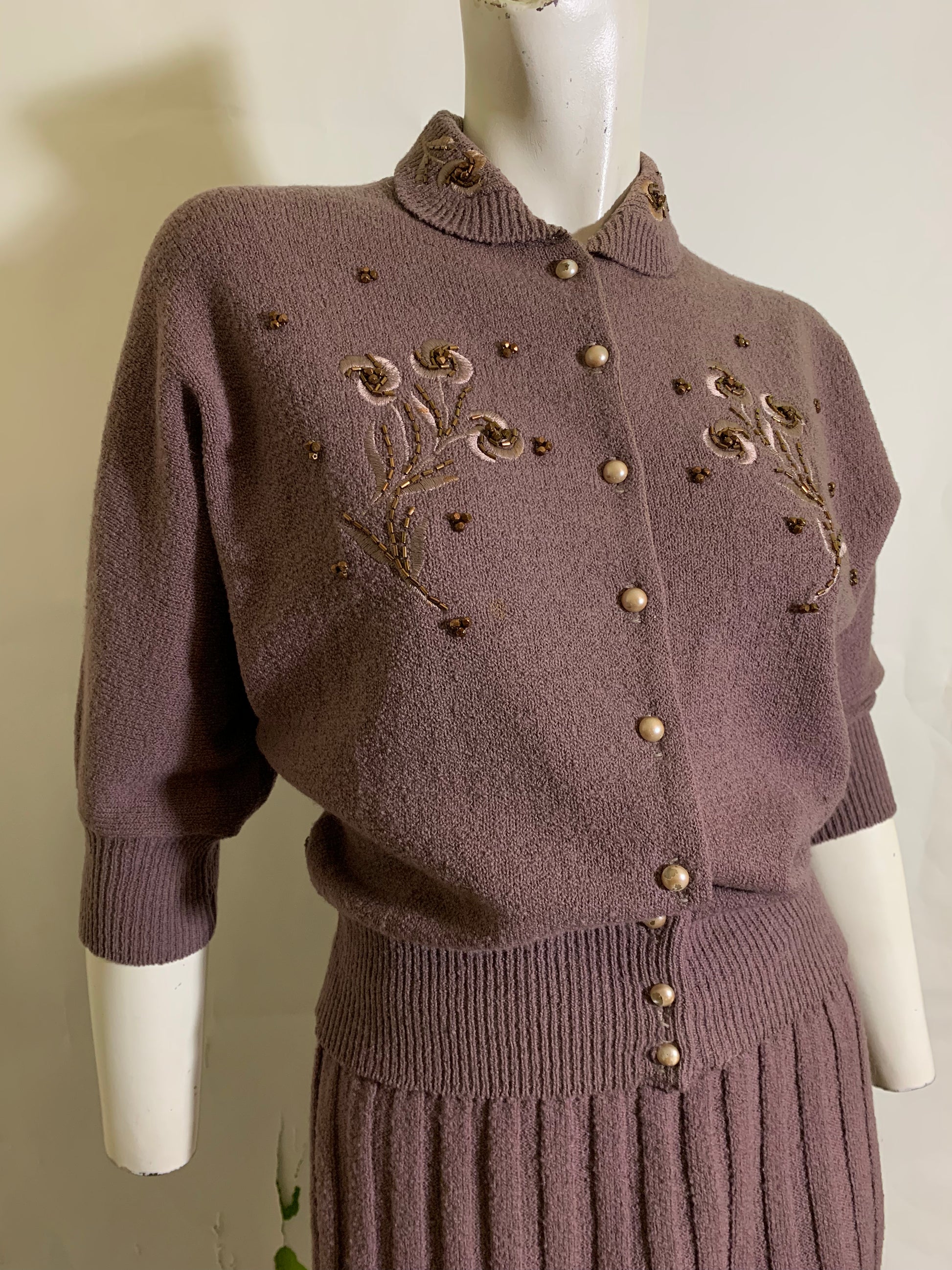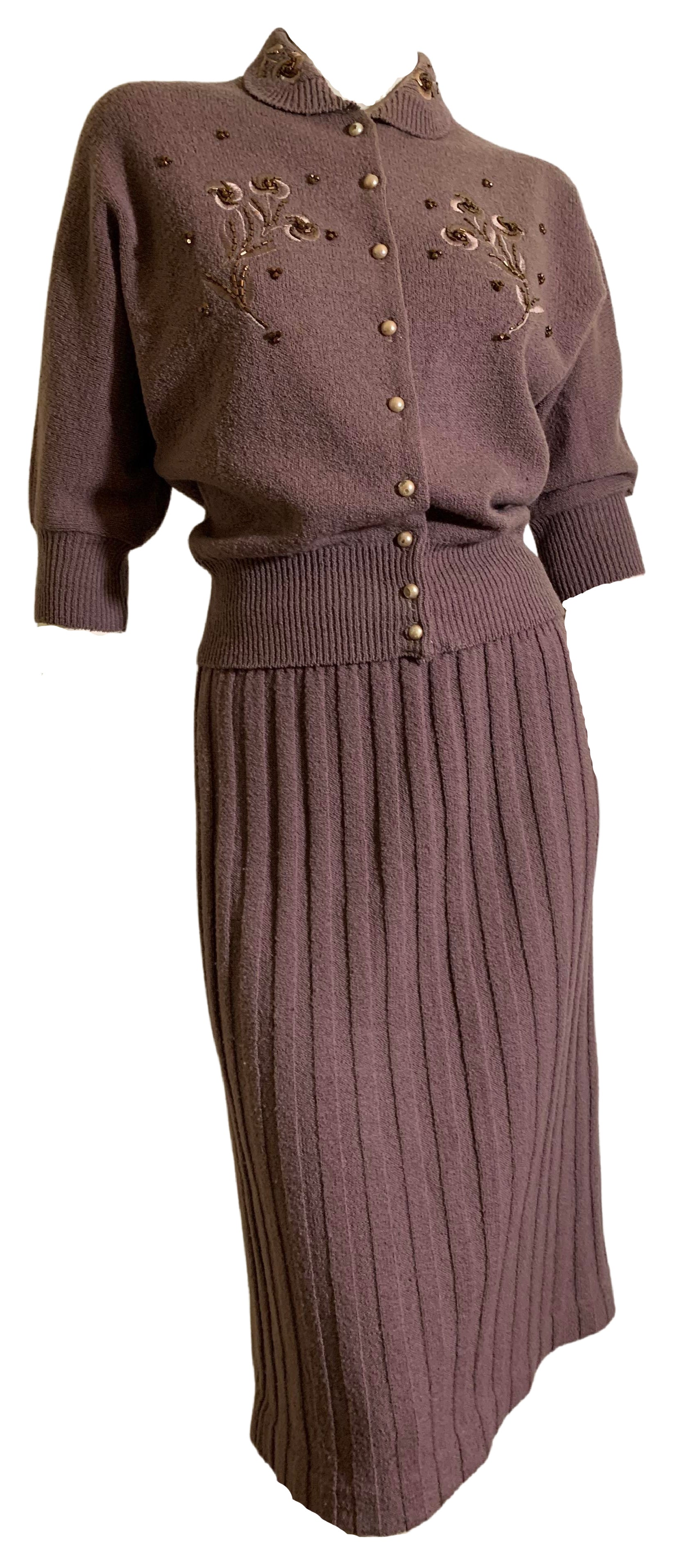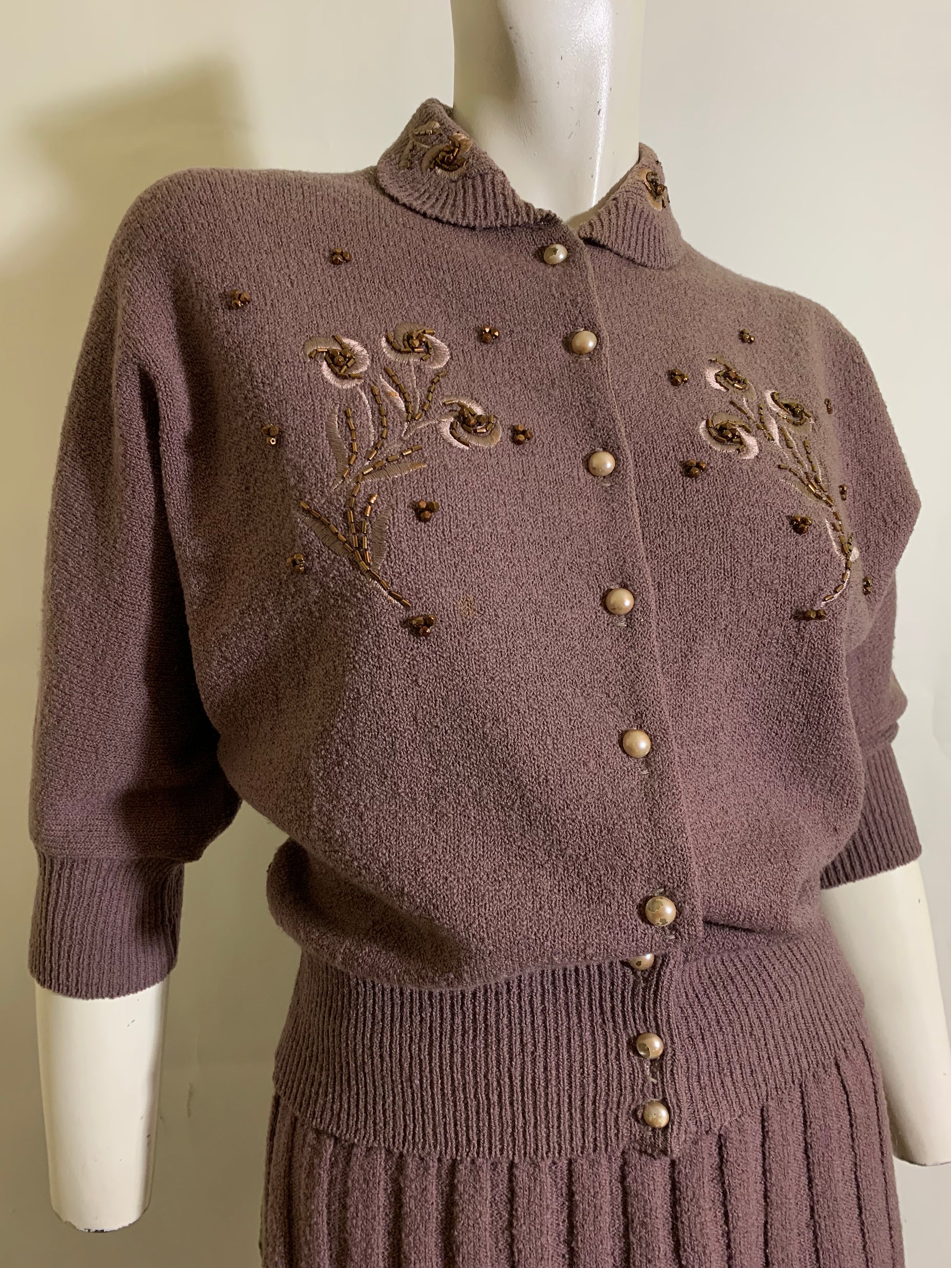 Rosy Brown Boucle Knit Wool 2 Pc Dress Set with Beading and Embroidery circa 1940s