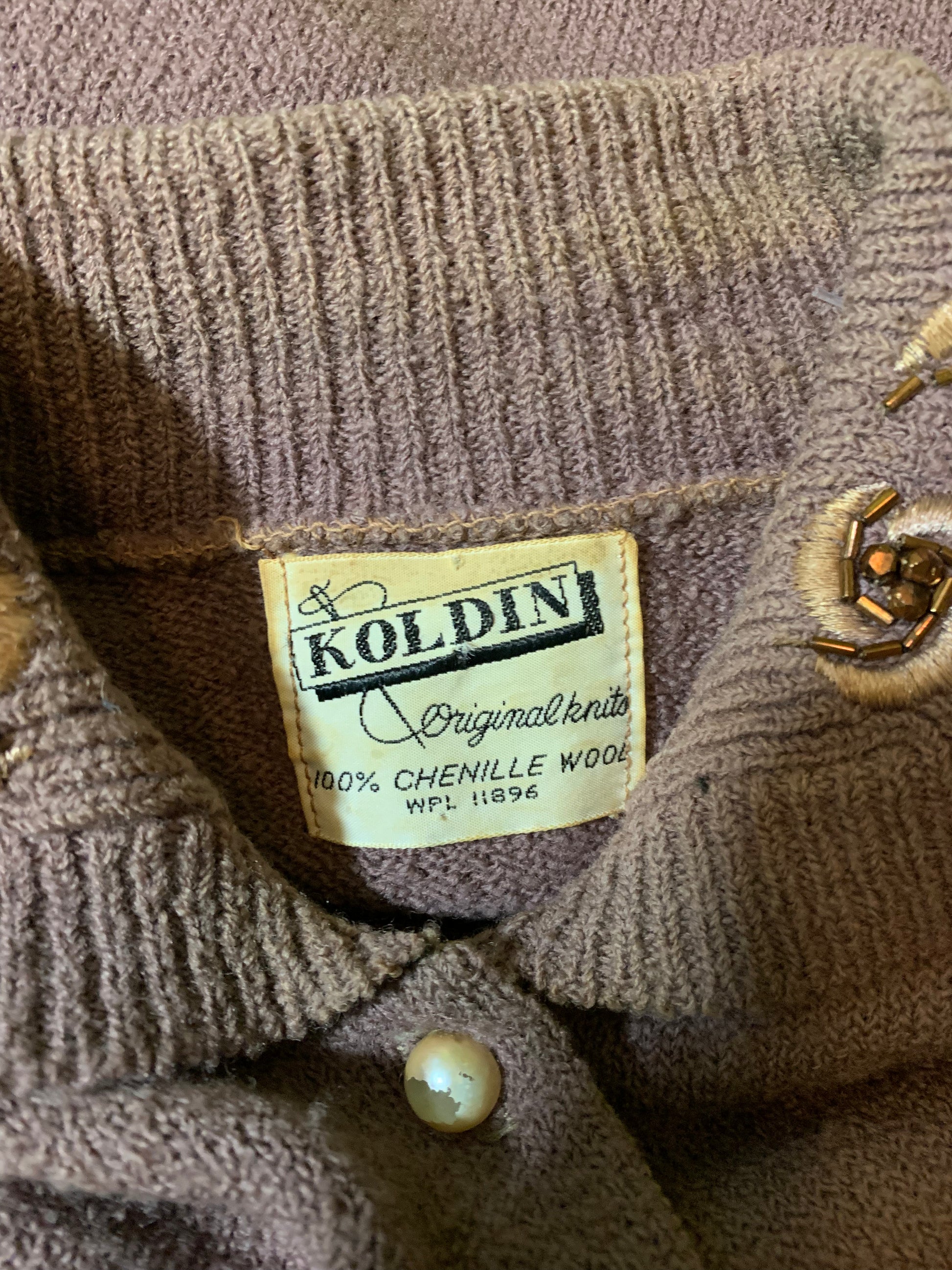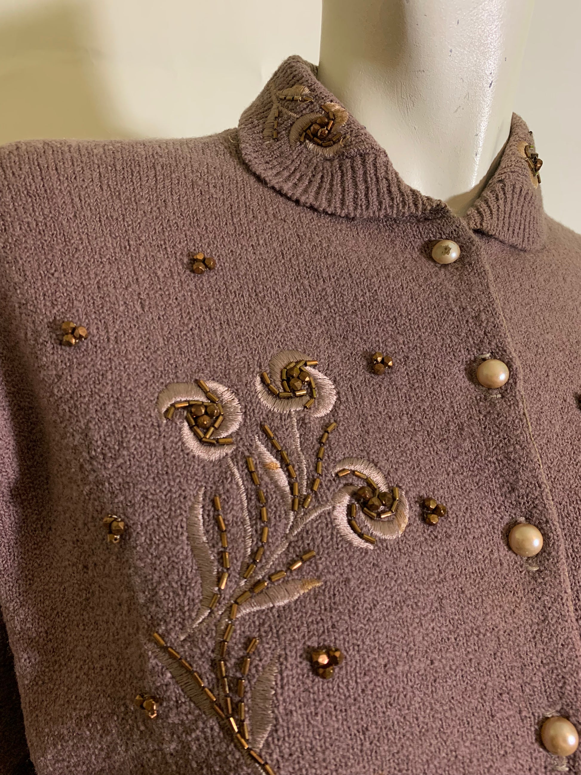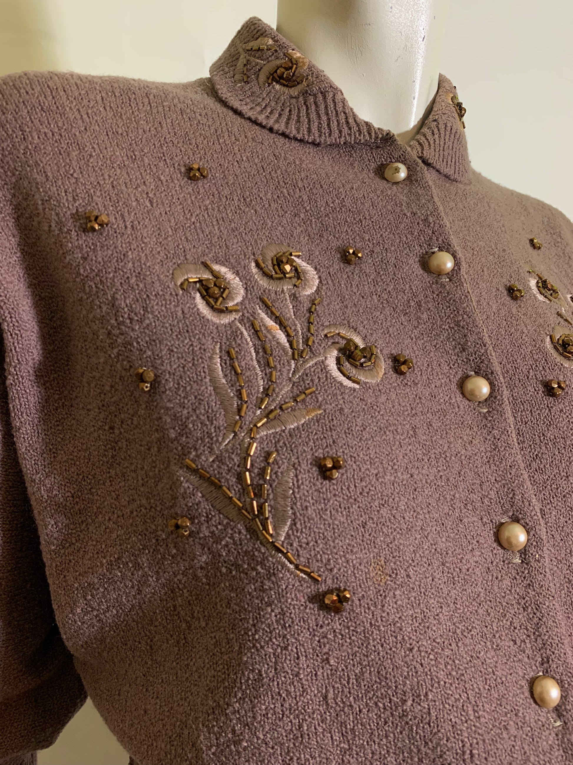 Rosy Brown Boucle Knit Wool 2 Pc Dress Set with Beading and Embroidery circa 1940s
