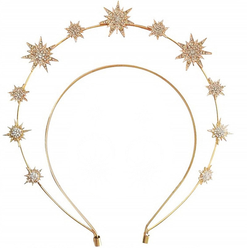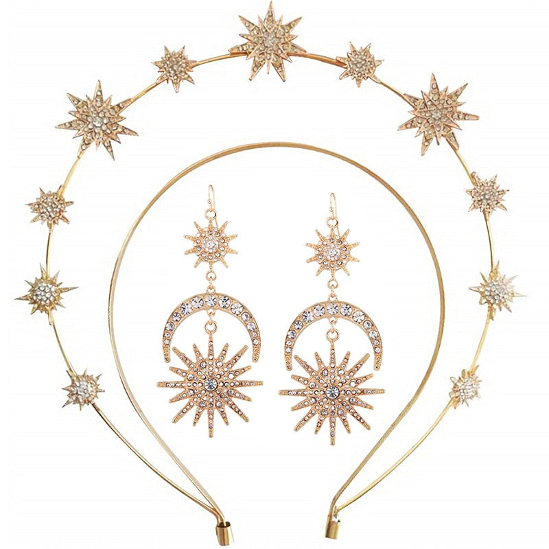Plated copper metal double "halo" style rhinestone star headband and matching earrings- together or separately. Halo is 2.5" tall, earrings 4" long. MODERN, arrives in 2-3 weeks.