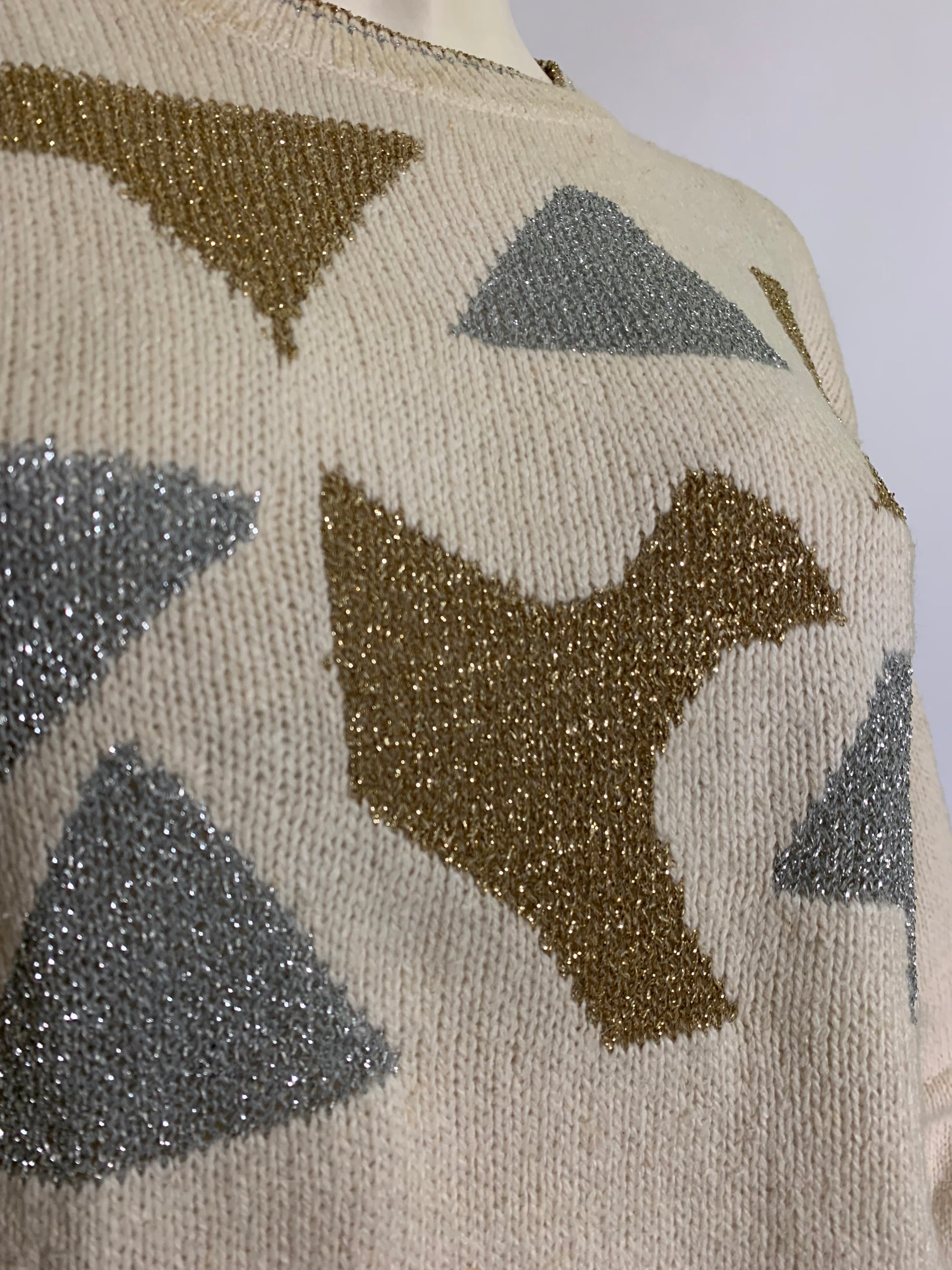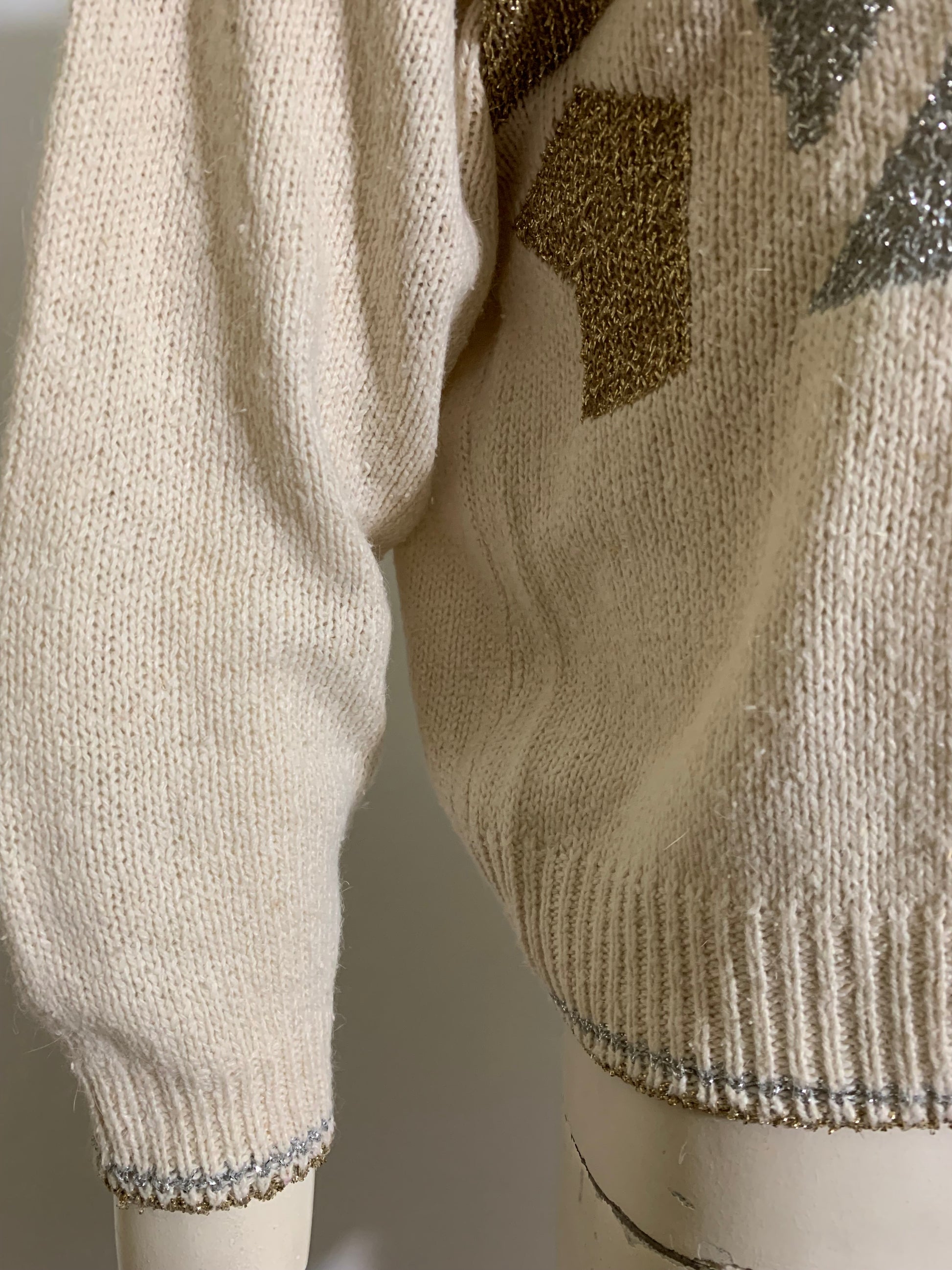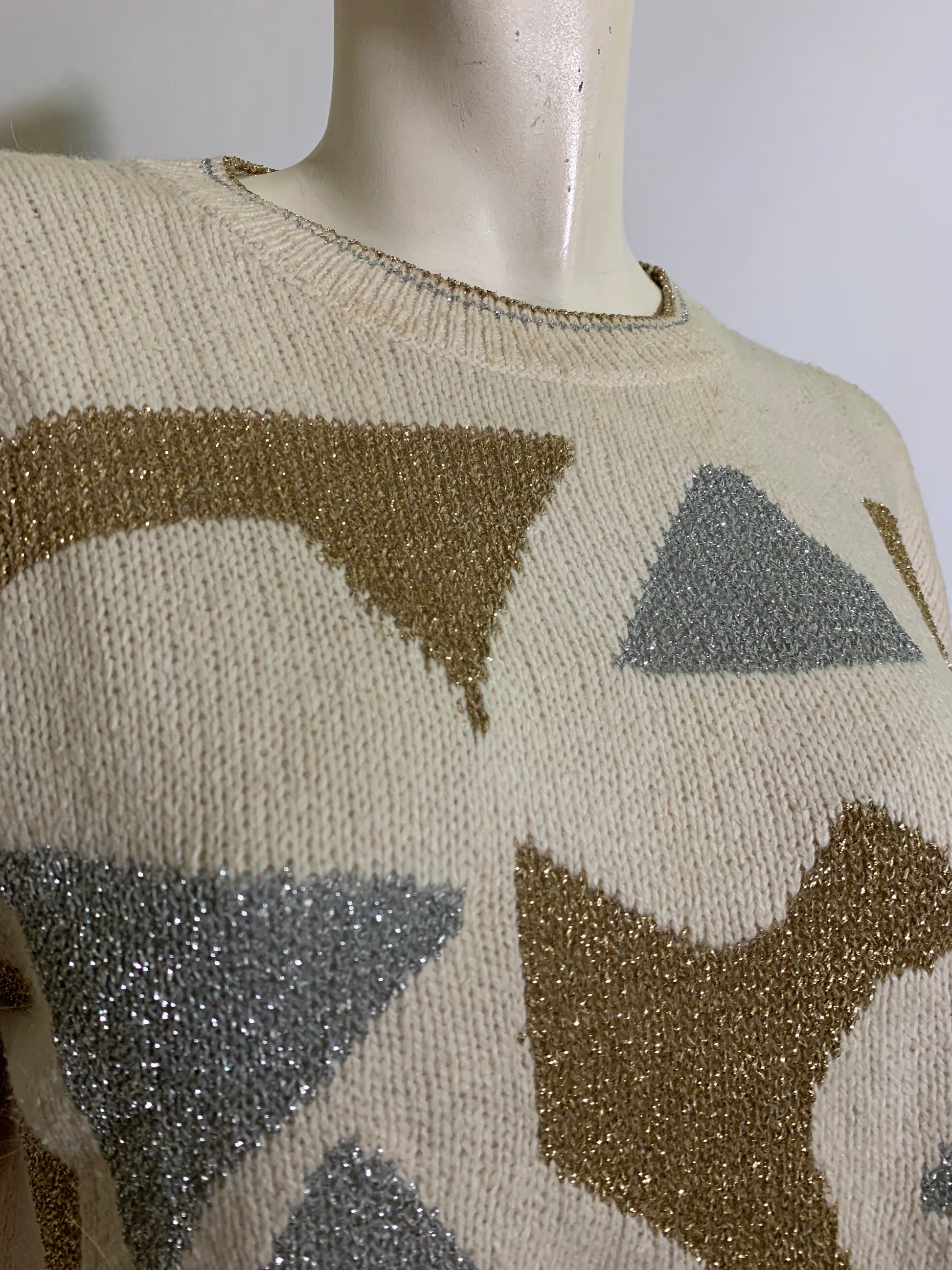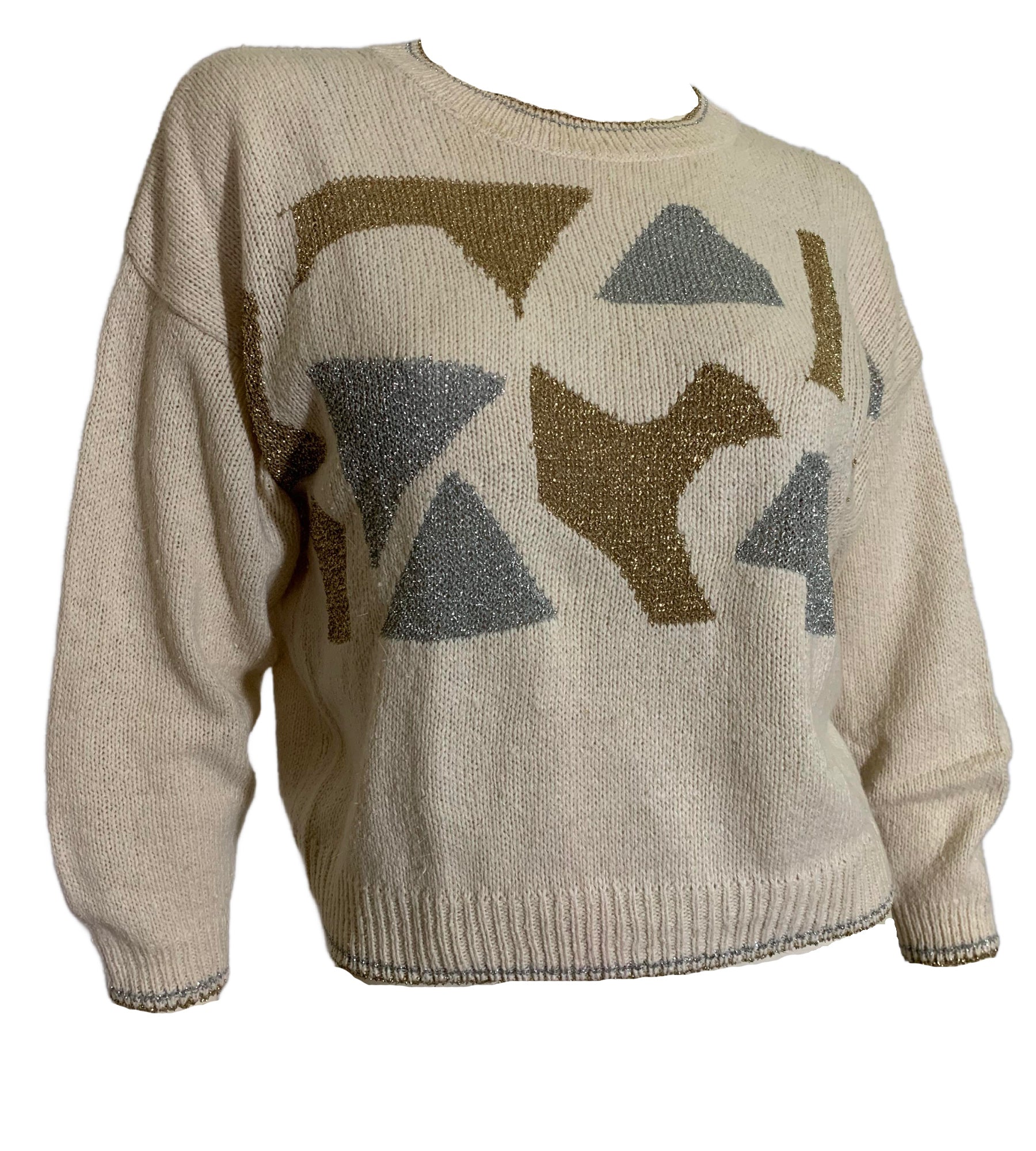 Angora Blend Sweater with Gold and Silver Metallic Geometric Design circa 1980s