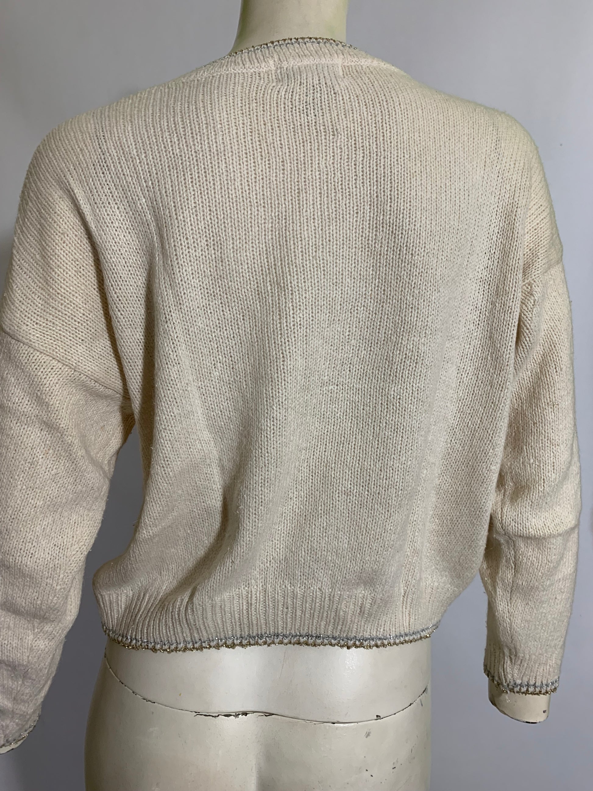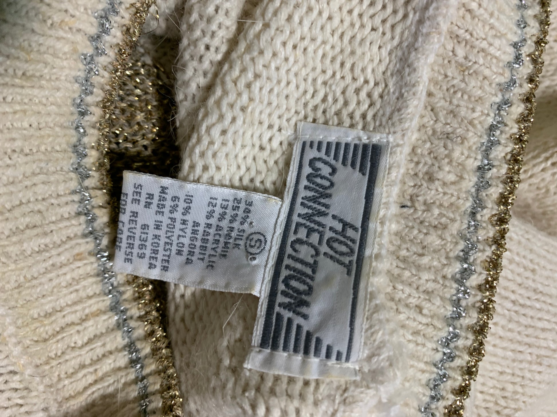 Wonderful 1980s winter white angora blend sweater with metallic gold and silver geometric design. By Hot Connection, tagged size S. No flaws.