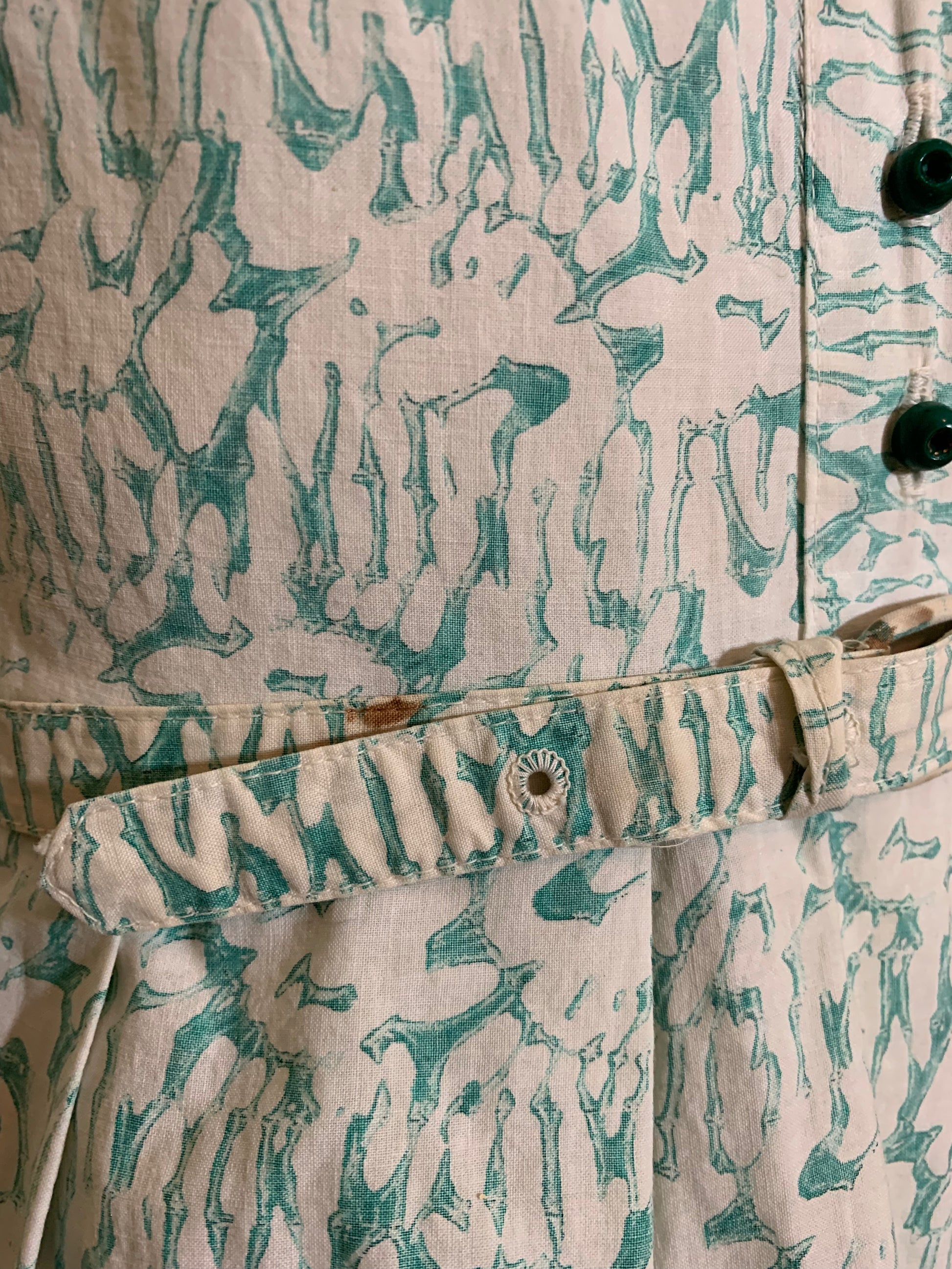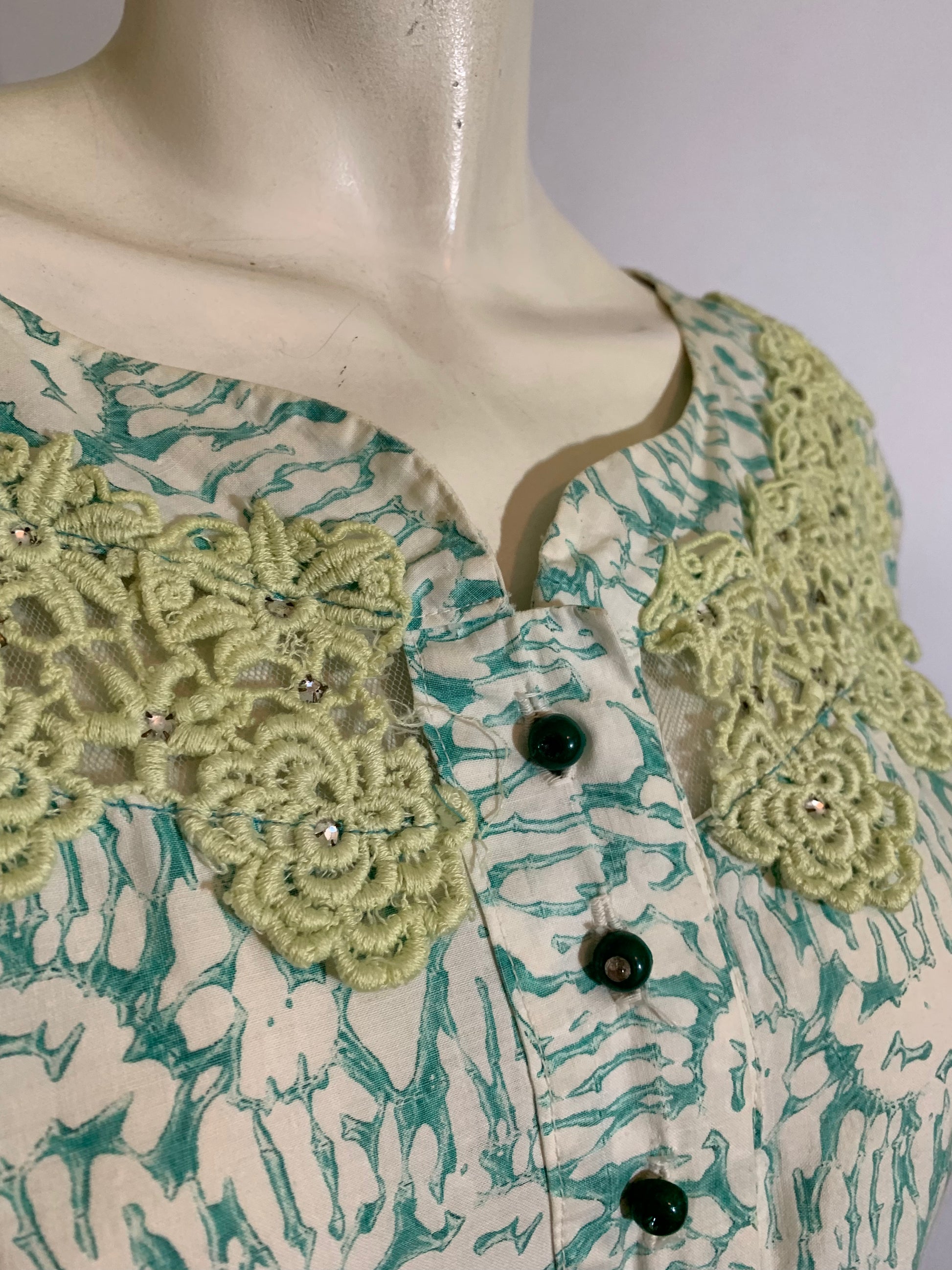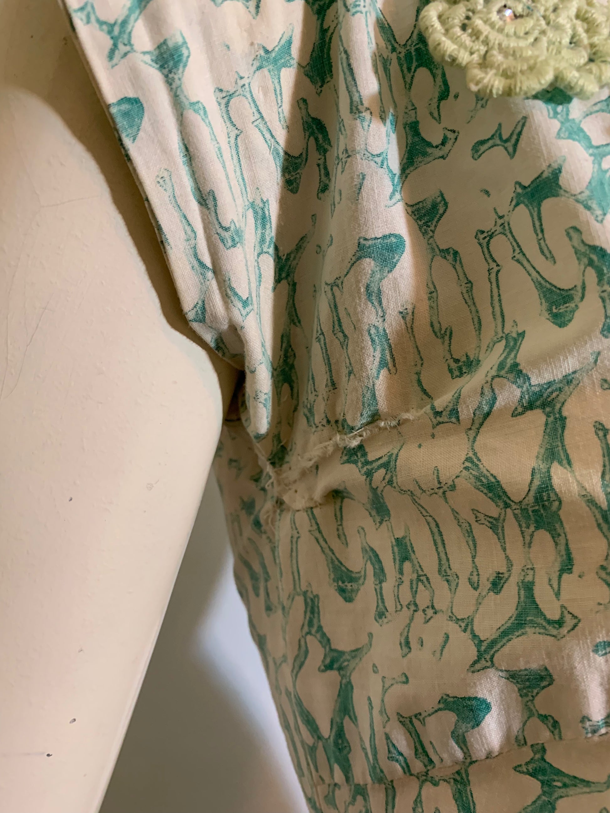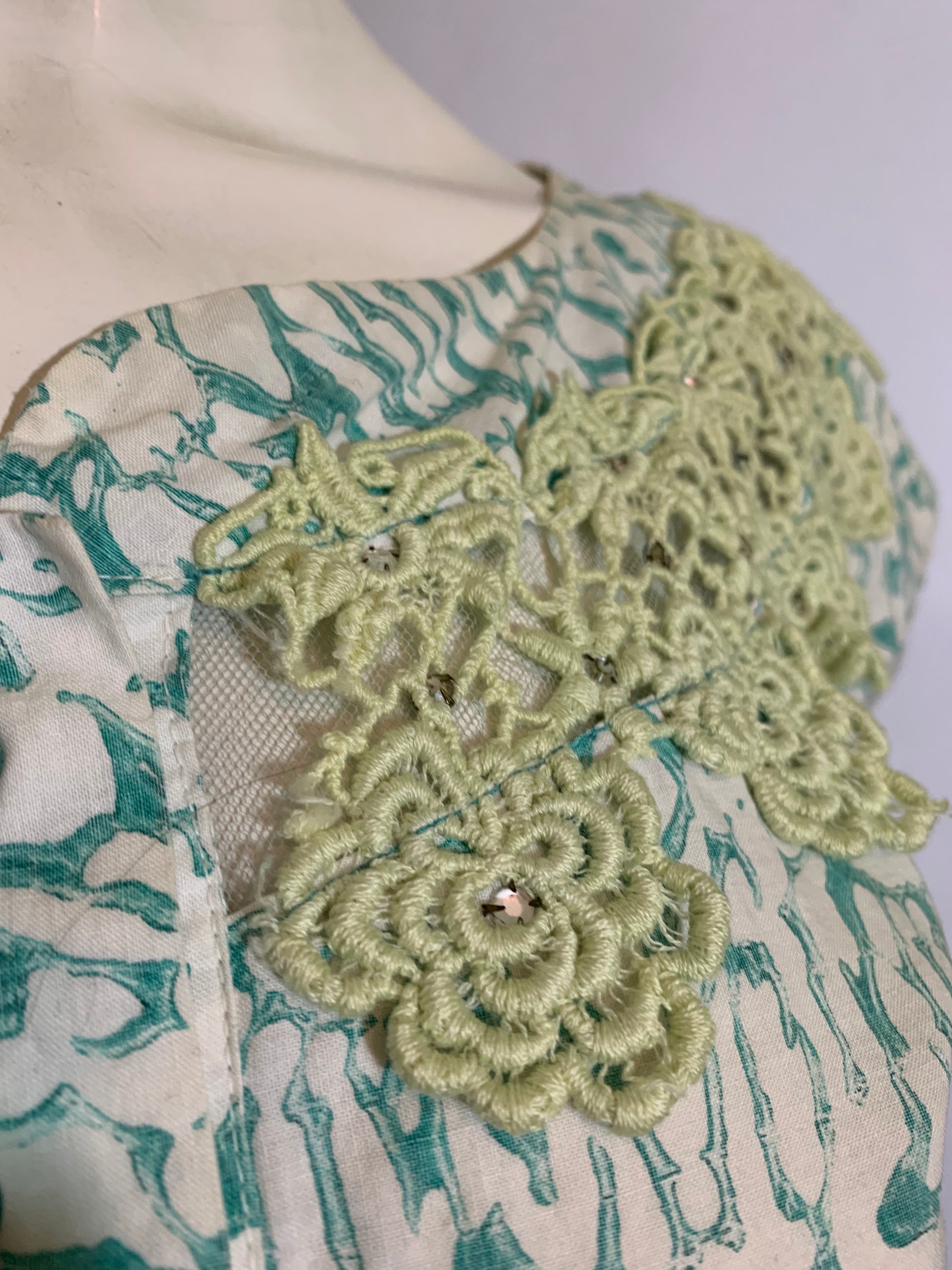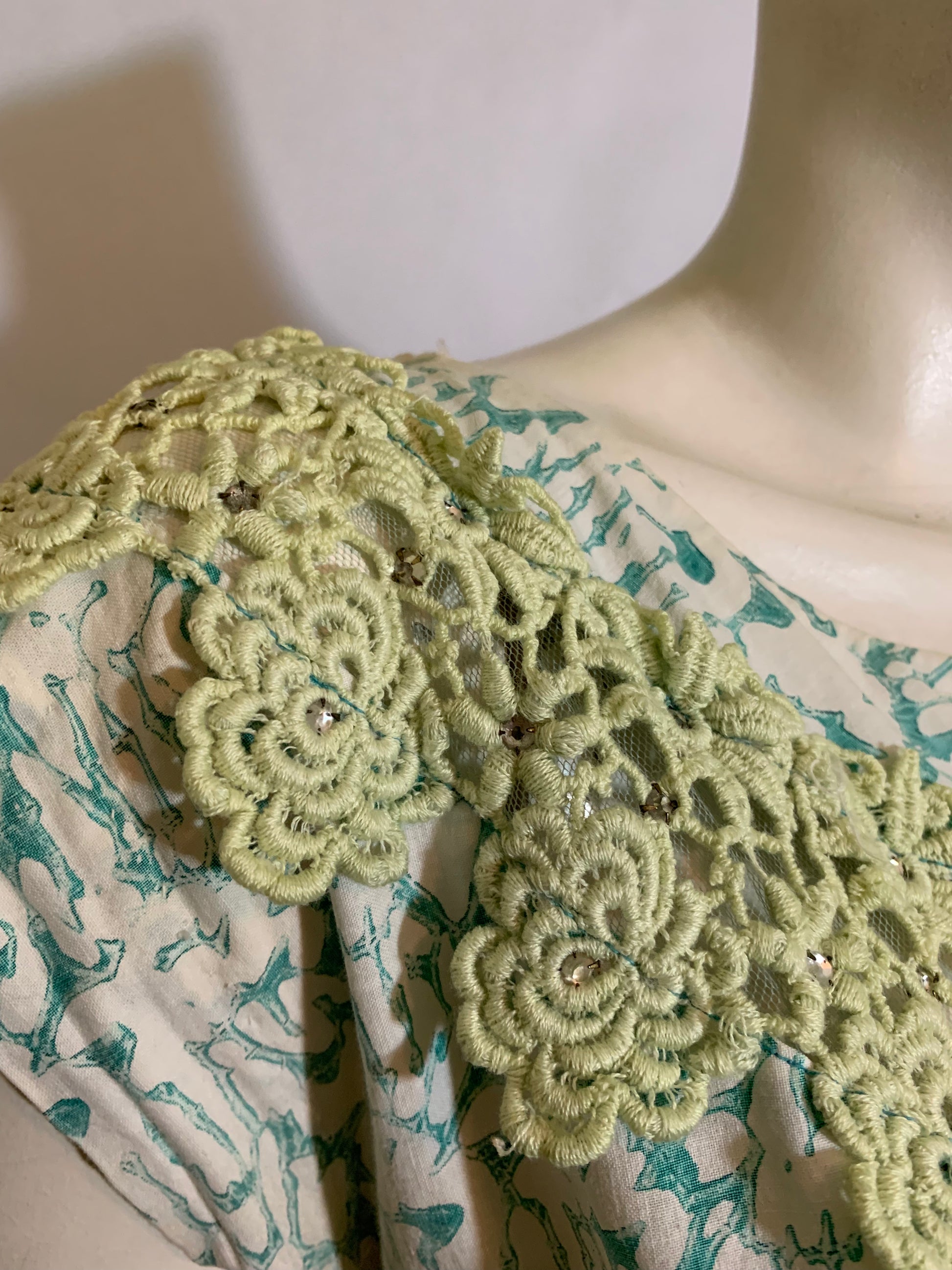 Aqua and white abstract print cotton dress with lime green lace and sheer collar dotted with rhinestones. Side zipper. Matching belt. Repairs under armpits, small spot on belt. As is- perfectly lovely and wearable as is.