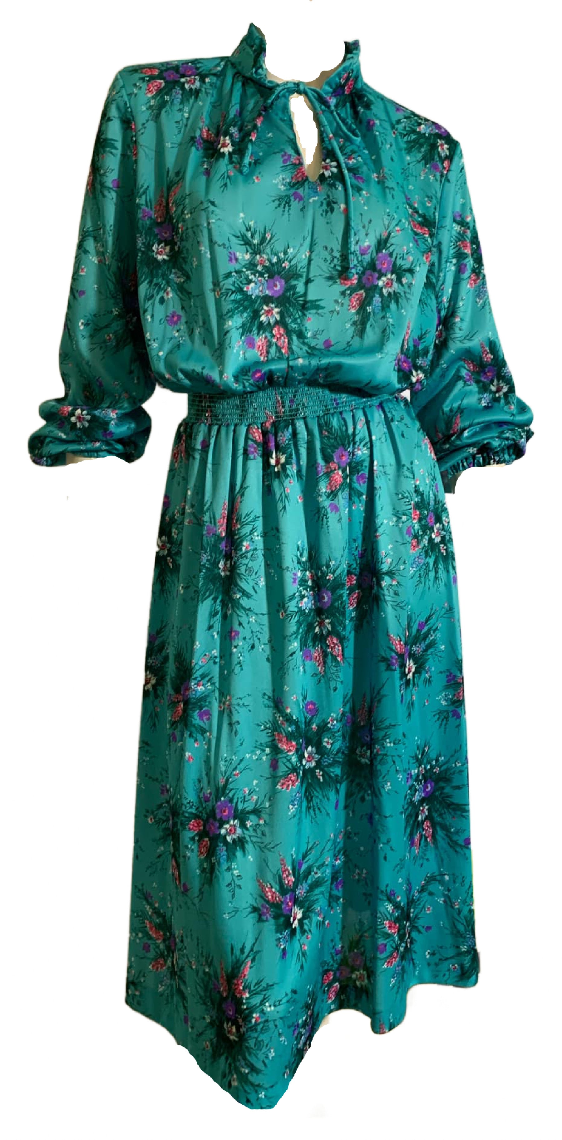Jersey poly blend 1970s dress in an aqua blue dress with lovely floral print, blouson bodice, smocked waist, keyhole neckline with ruffled collar. Elastic cuffs. Unlined, no flaws.