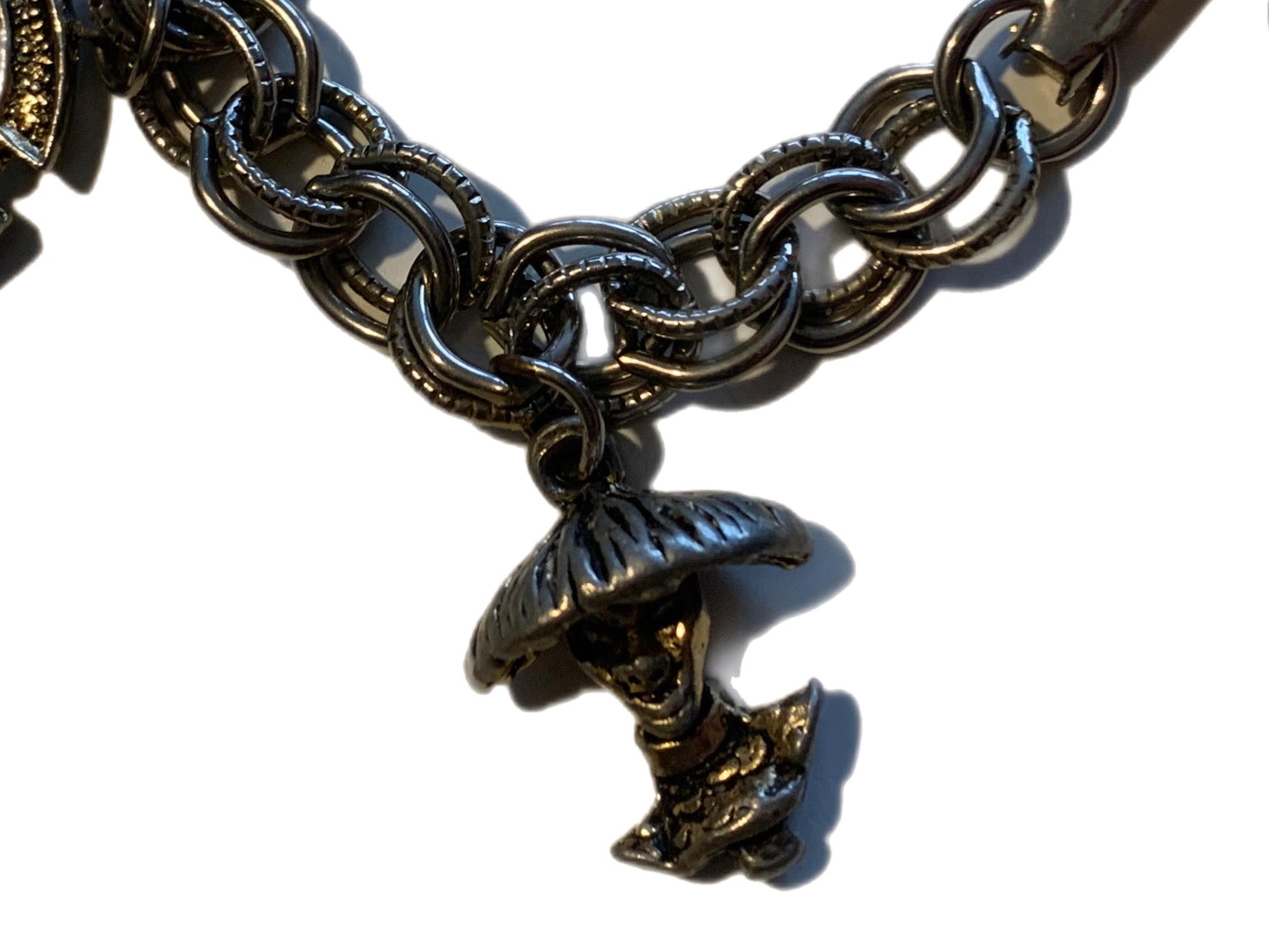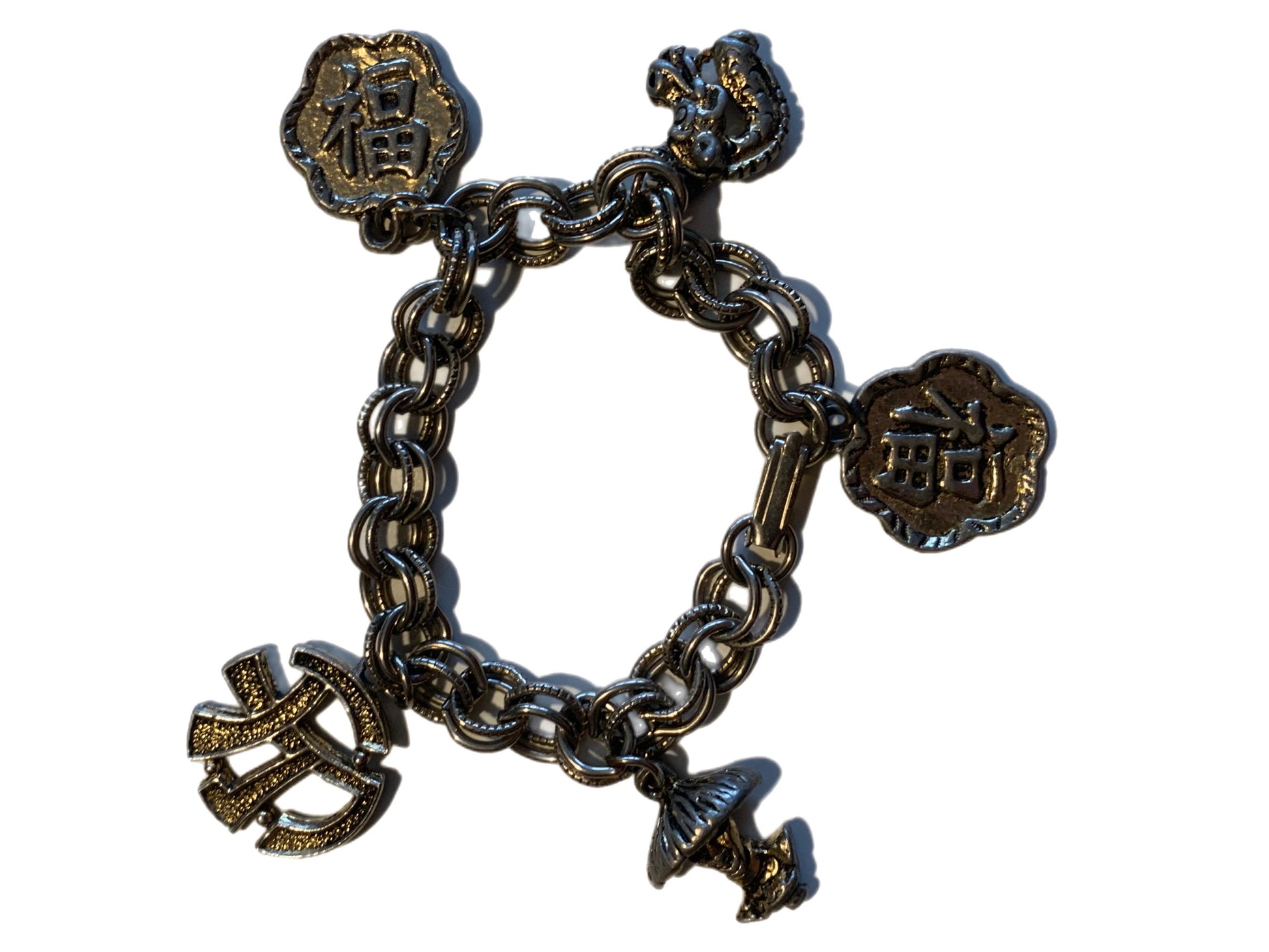Silver tone metal charm bracelet with Asian themed charms. Symbols, dragon, man. No markings, no flaws. 7" around.