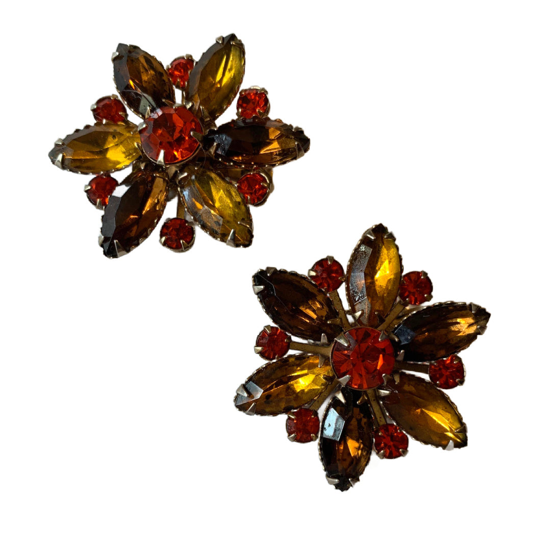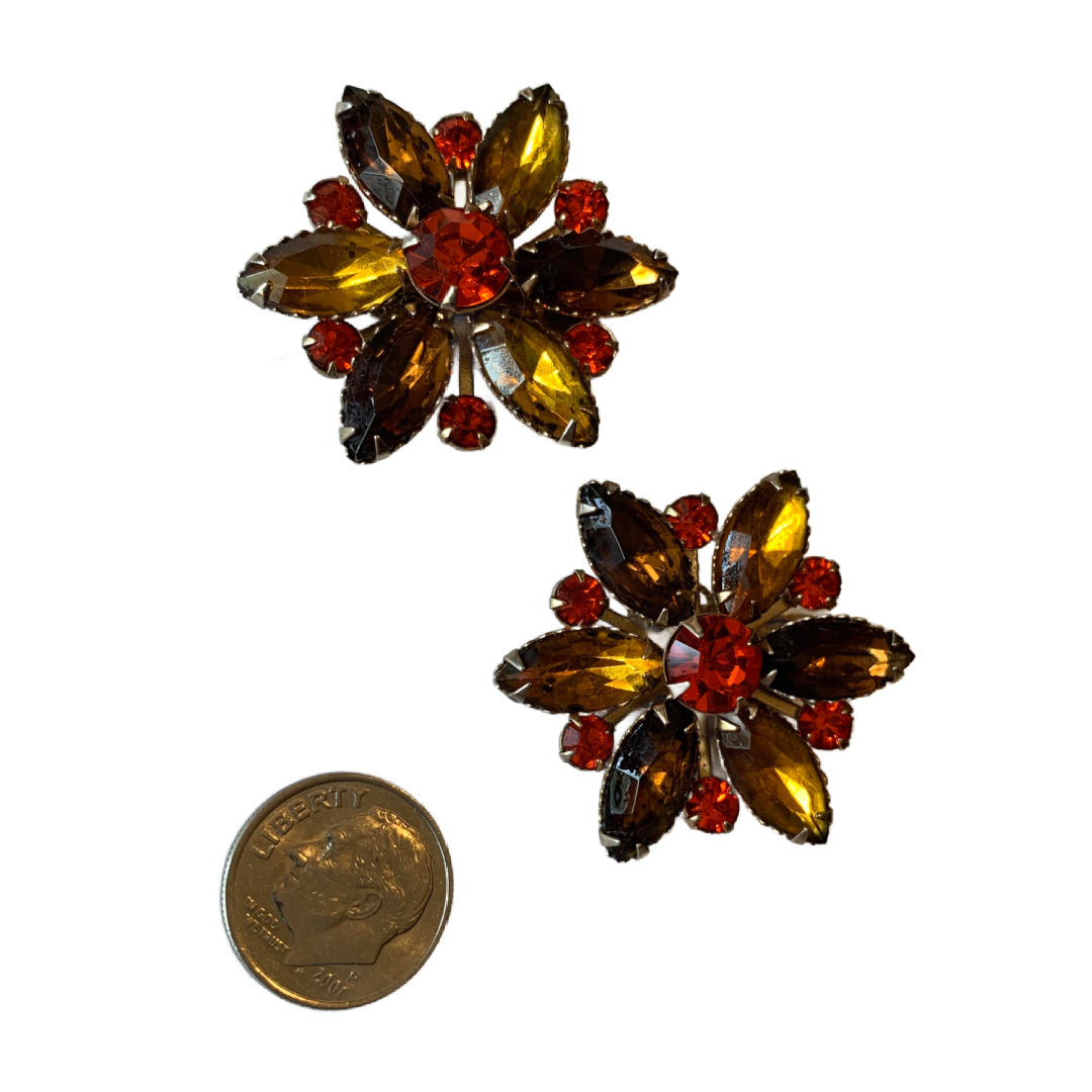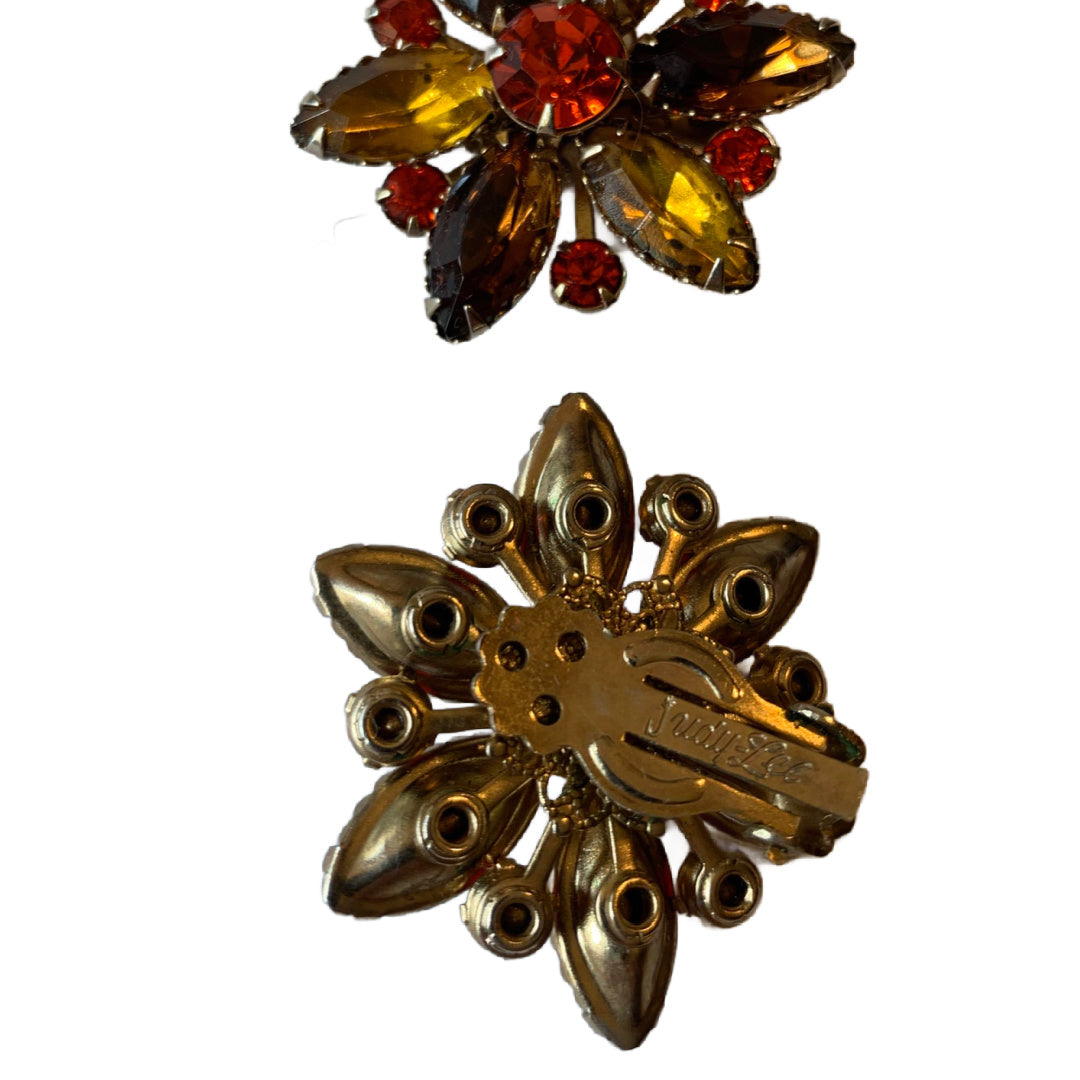 Fall hued bold, clear colored rhinestone flower shaped clip earrings from the 1960s by Judy Lee. No flaws. 1 1/2".