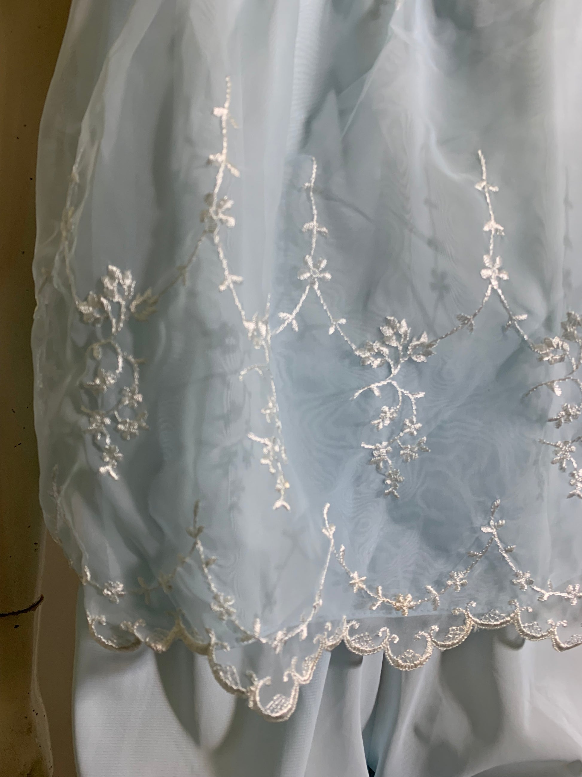 Darling baby blue 1960s 2 pc nylon pajama set with capri pants slit at sides, blouson top with chiffon embroidered overlay, puffed short sleeves. Slumber party perfection! No flaws, no label.