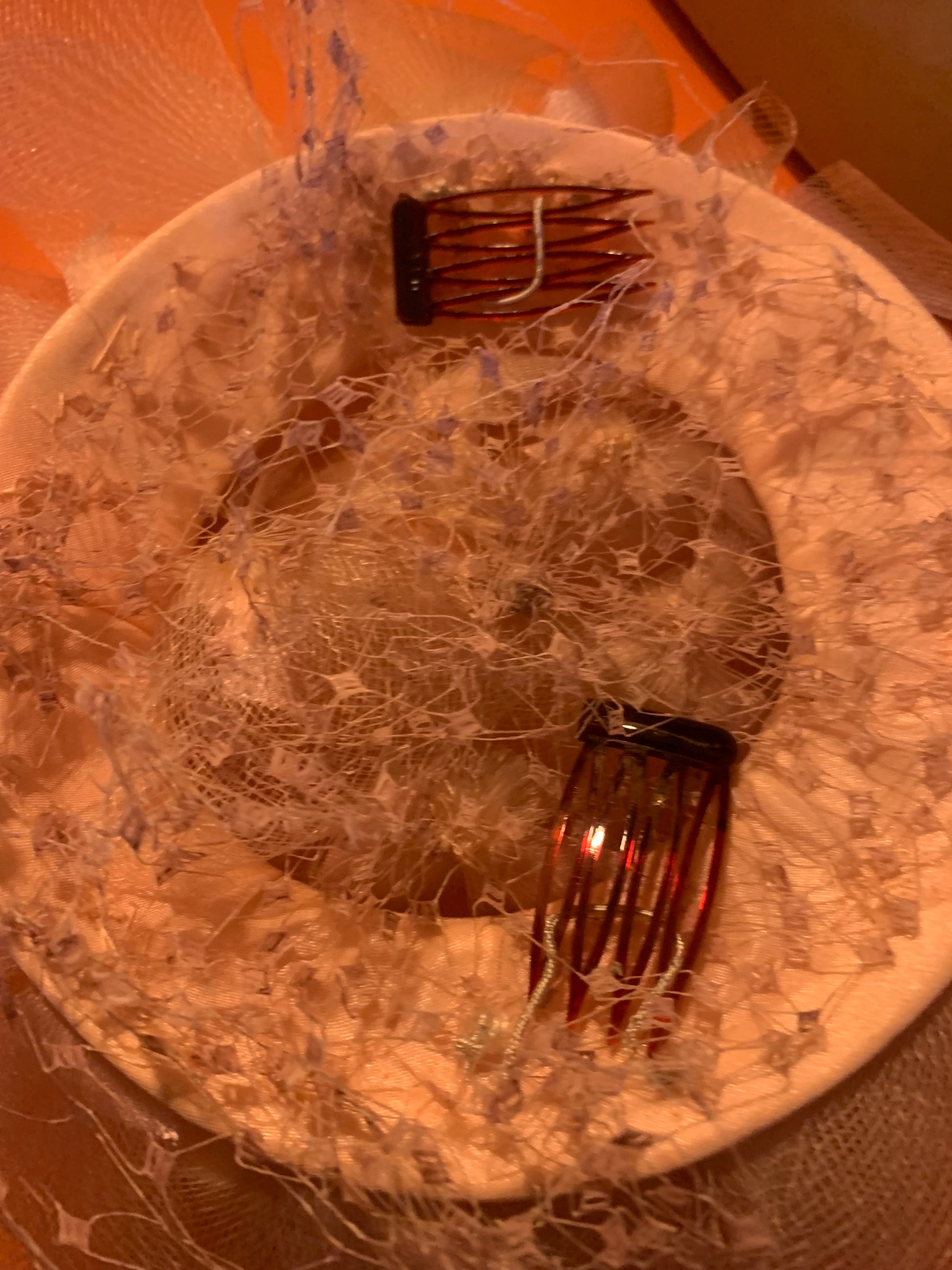 Baby pink looped sisal and little velvet bows wire circle hat with side hair combs. Missing veiling, one size, 5" across ring, 8" across with sisal. No label.