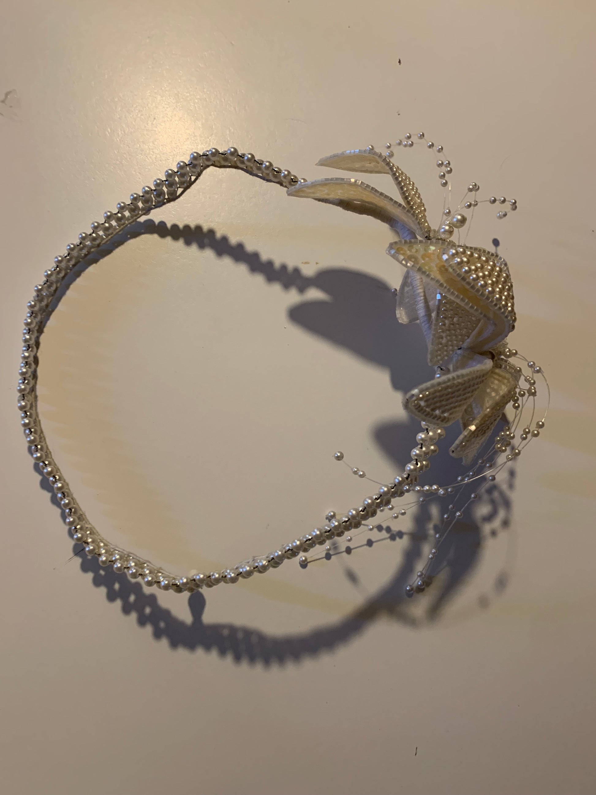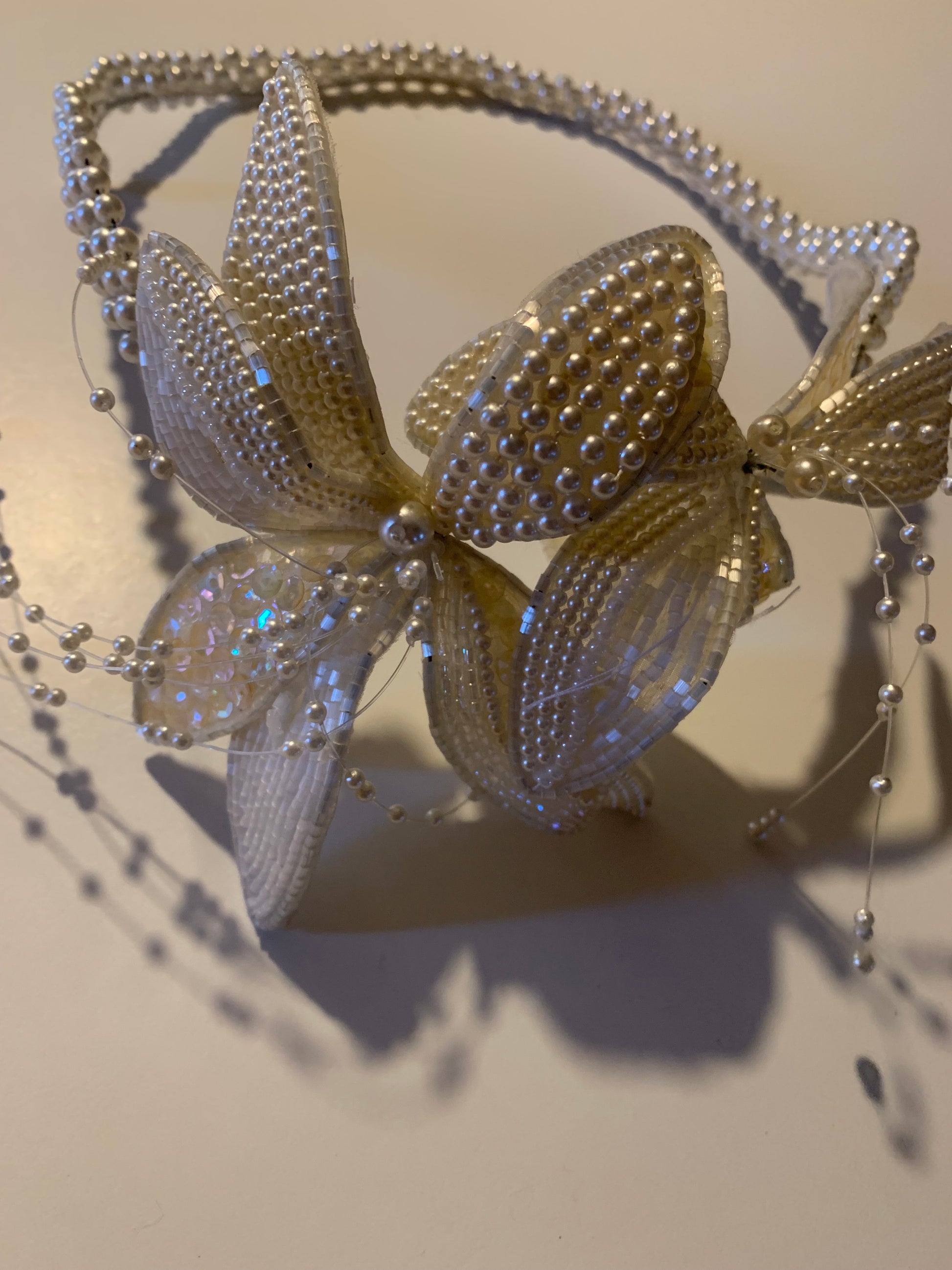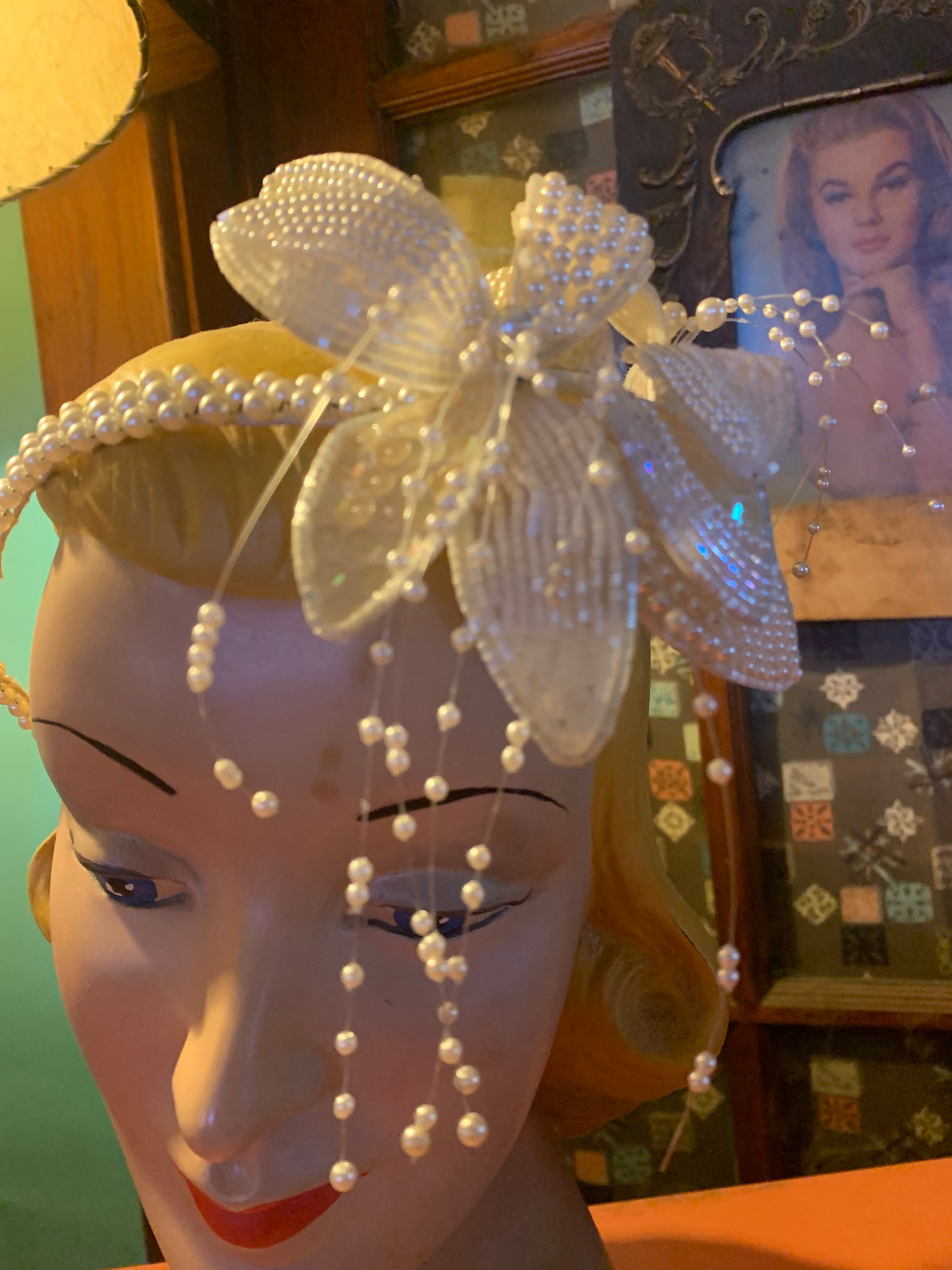 1980s lily design faux pearl, sequin and iridescent beaded bridal headpiece, 24" around. Lily is 8" across. No flaws, fully wired.