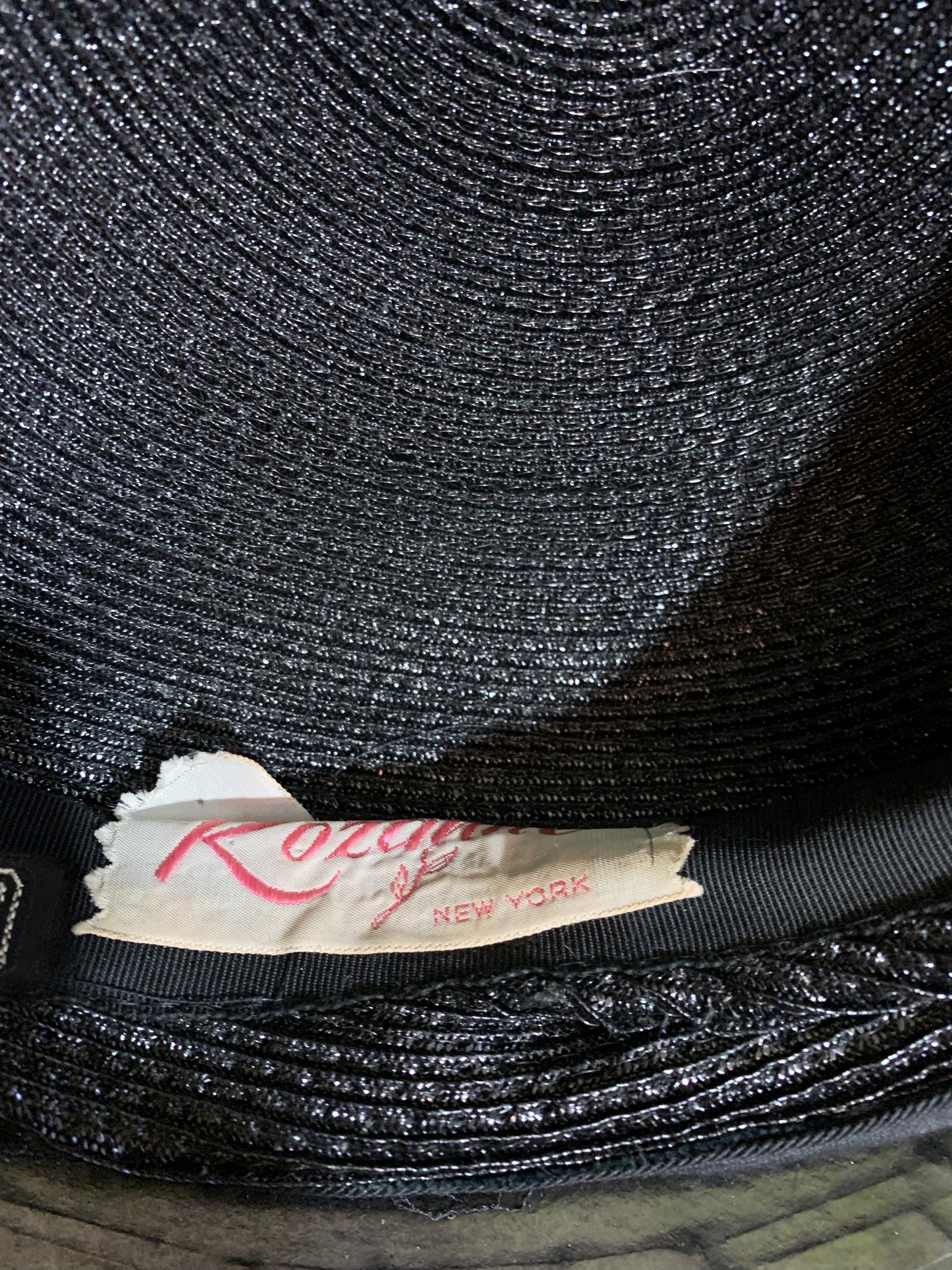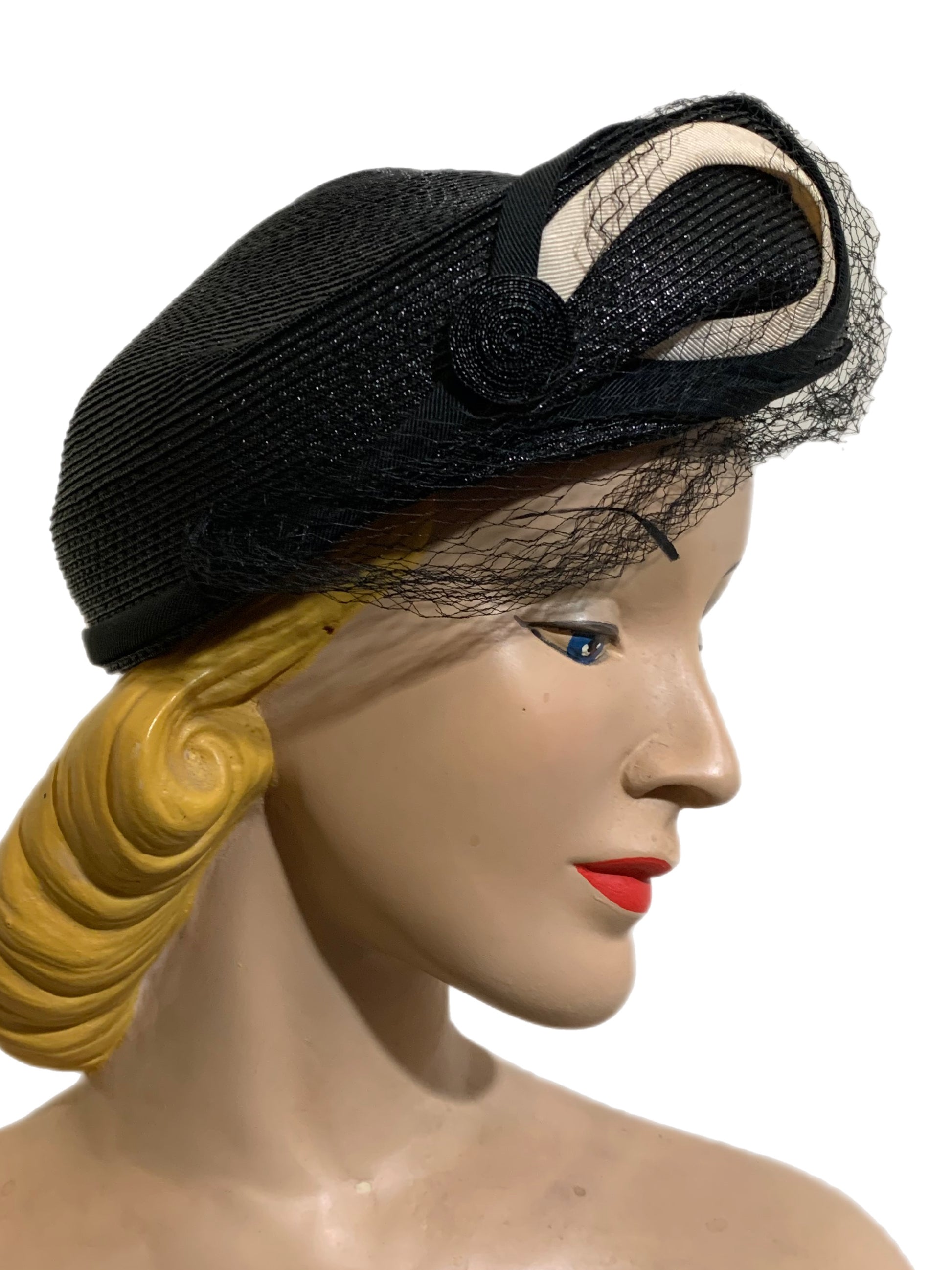 Black and ivory sisal hat with swirled front detail, rounded sides. Veiling has a little damage. No label. Size 22 1/2.
