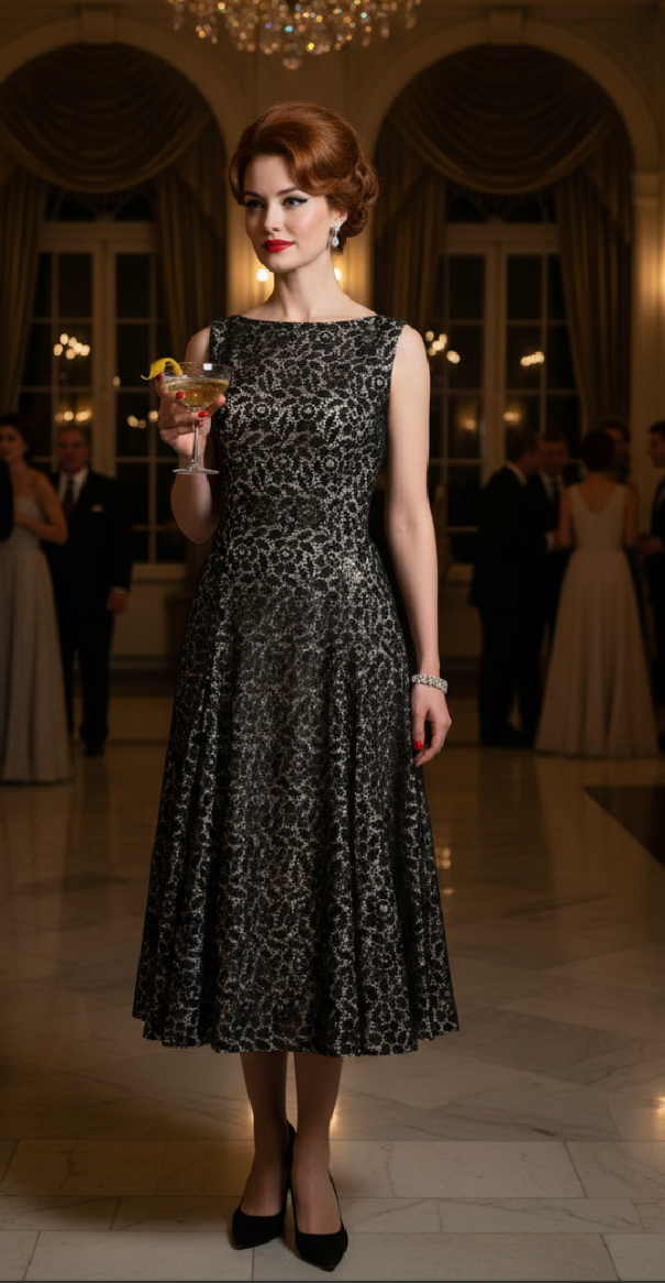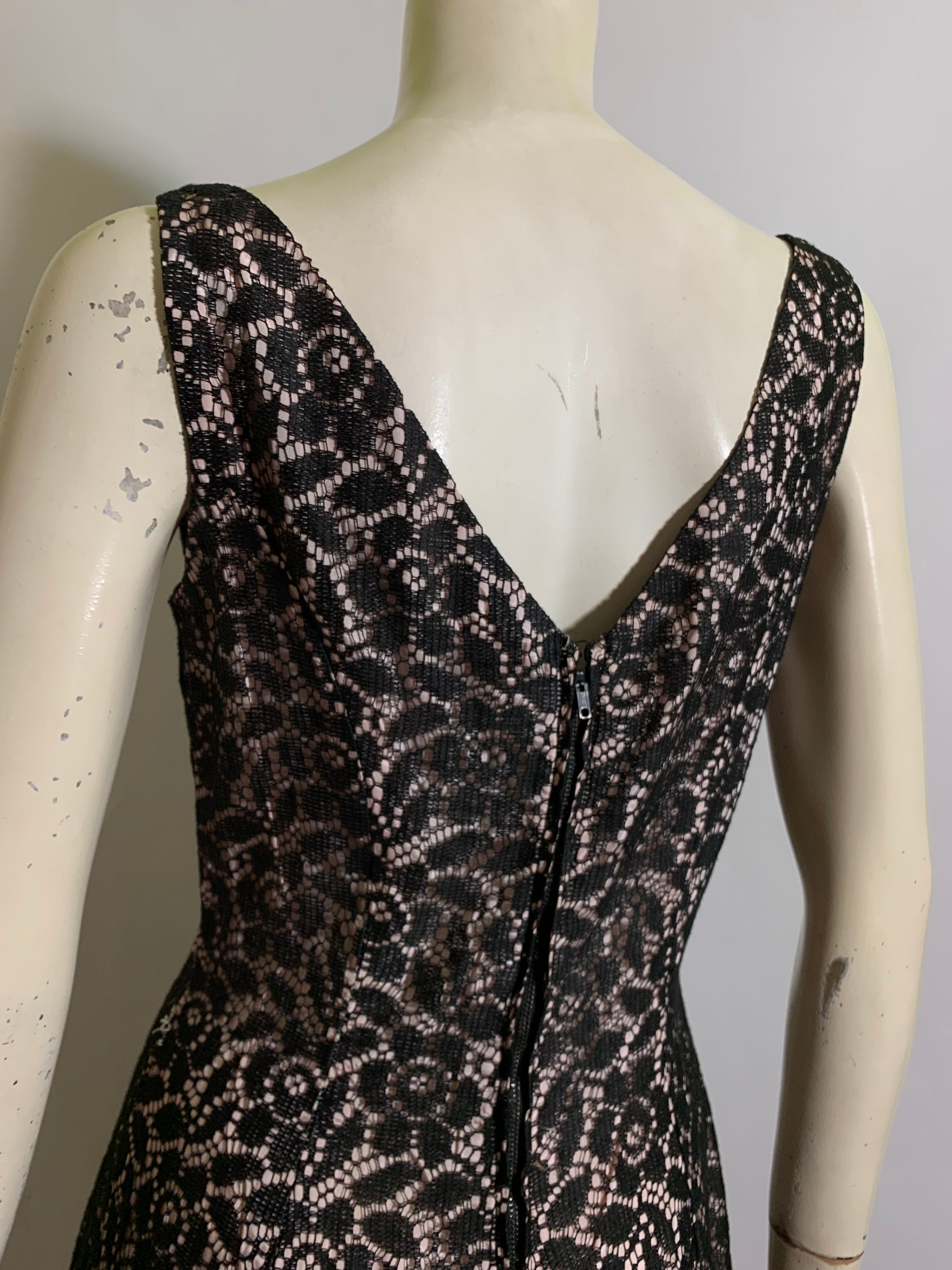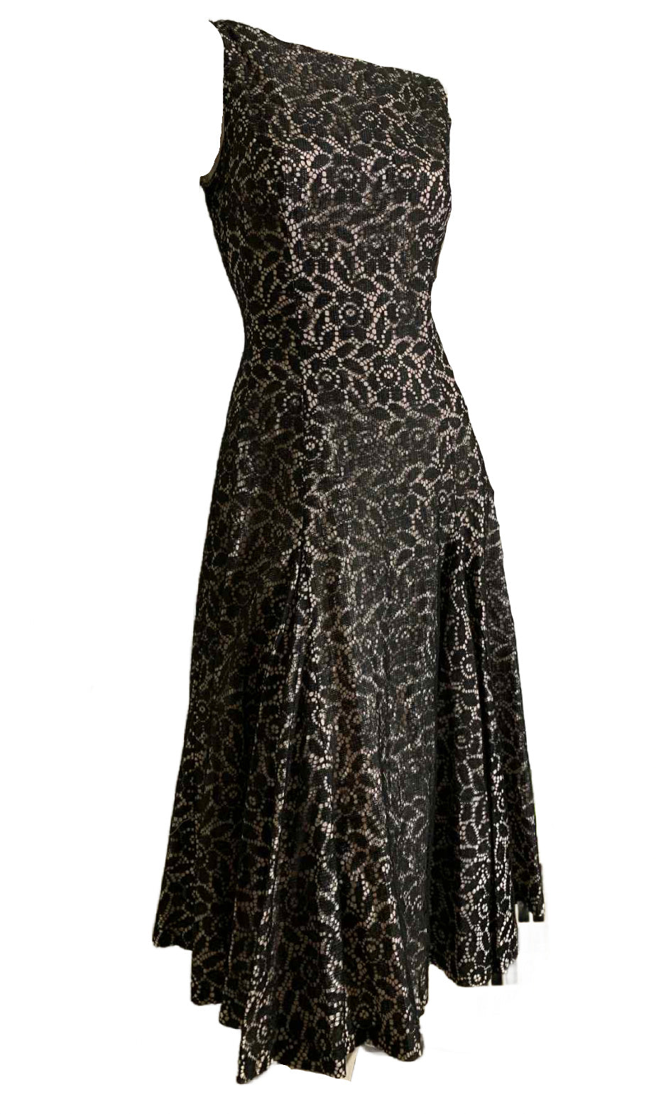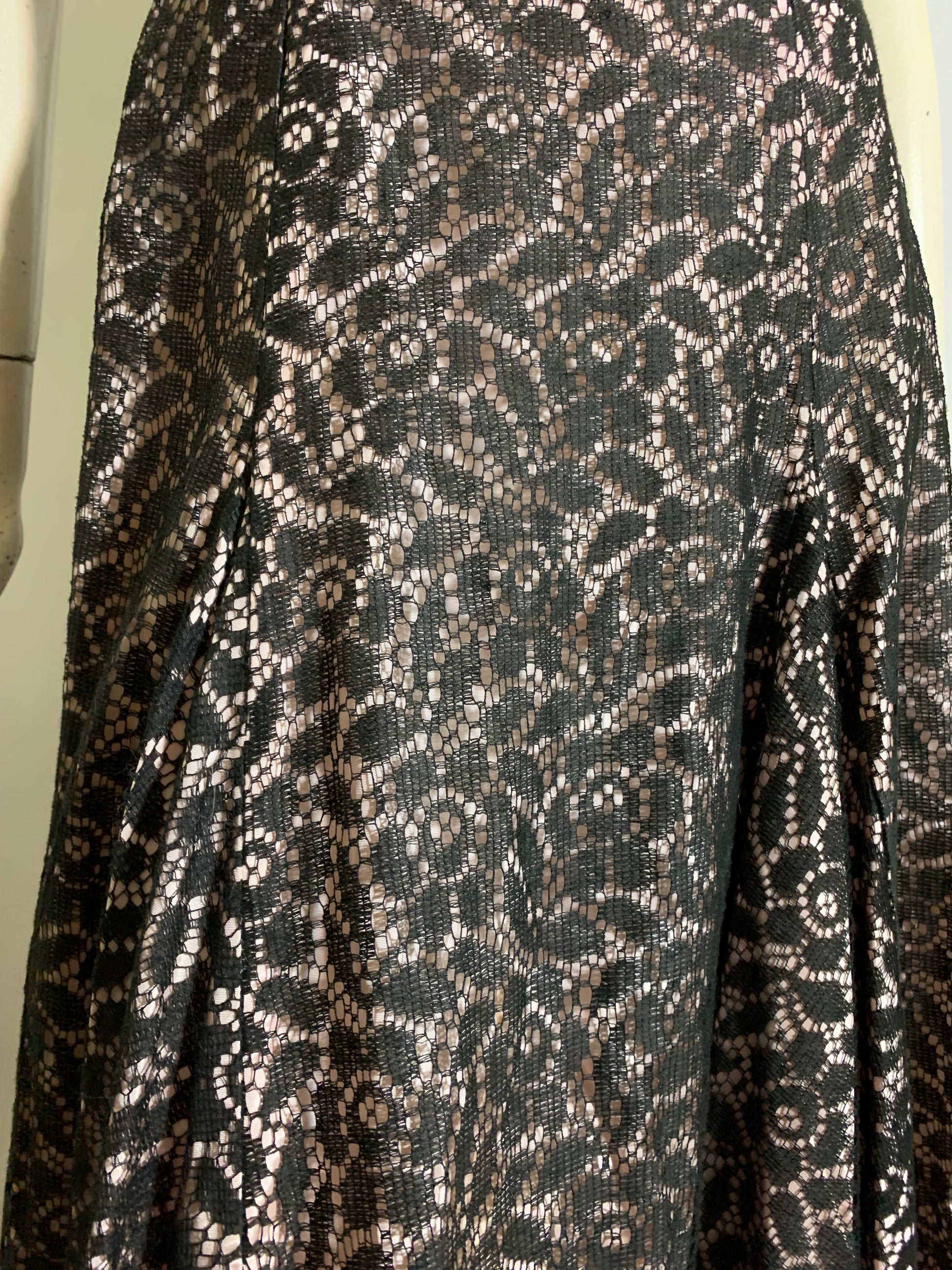 Stylish black lace party dress with palest pink acetate lining, full skirt with pleats at front hips, princess seamed. Back metal zipper. No flaws, no label.