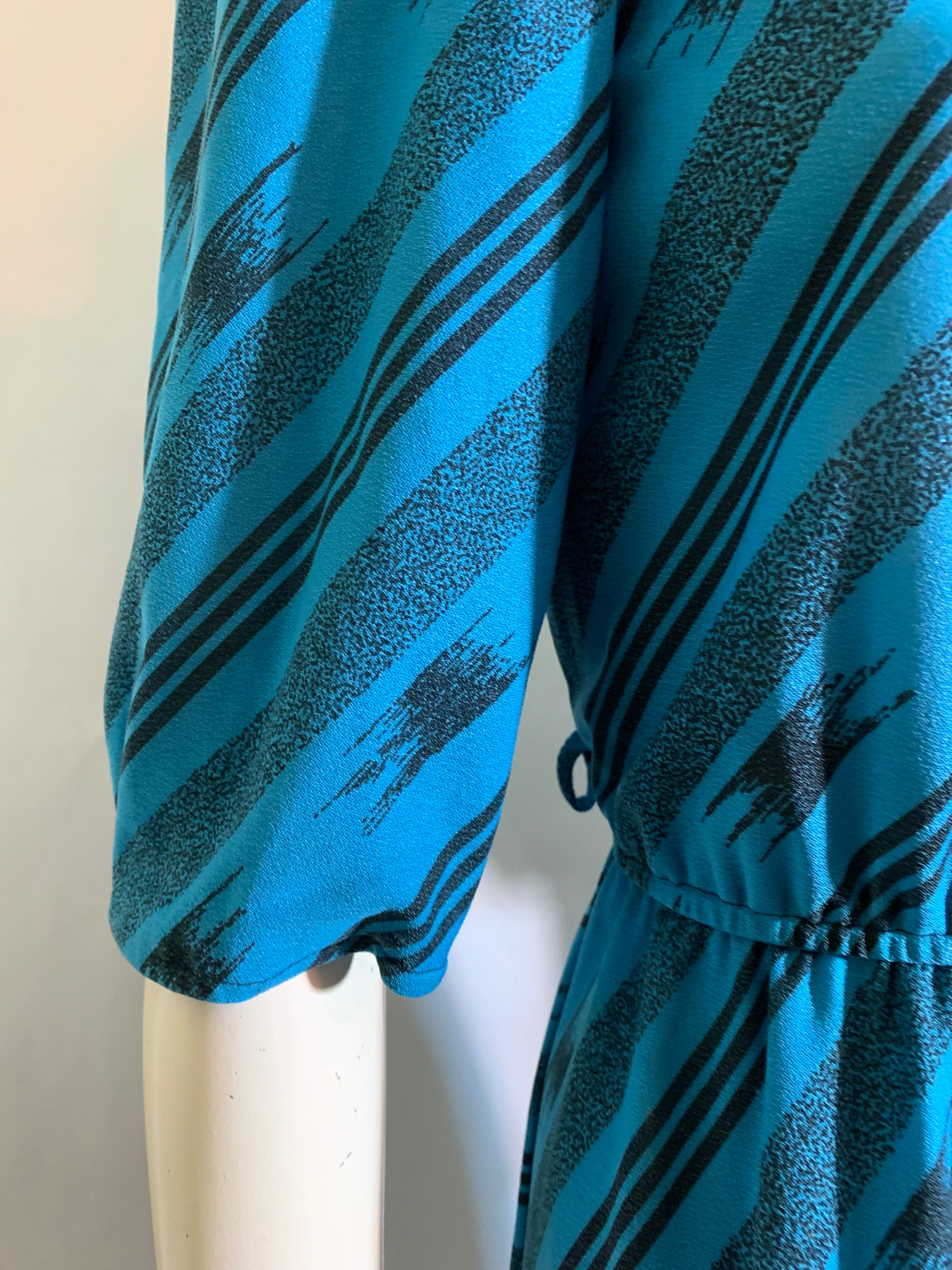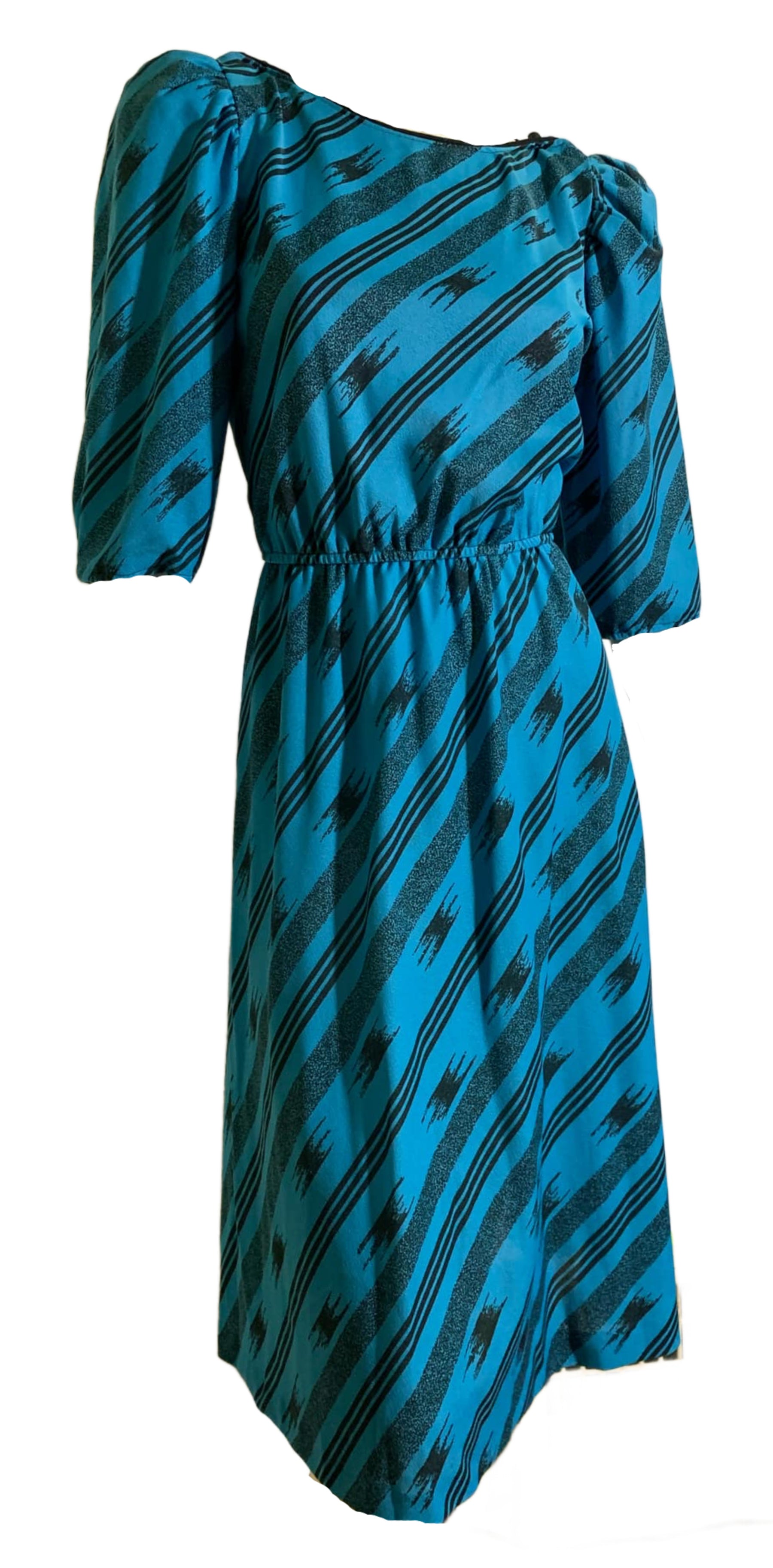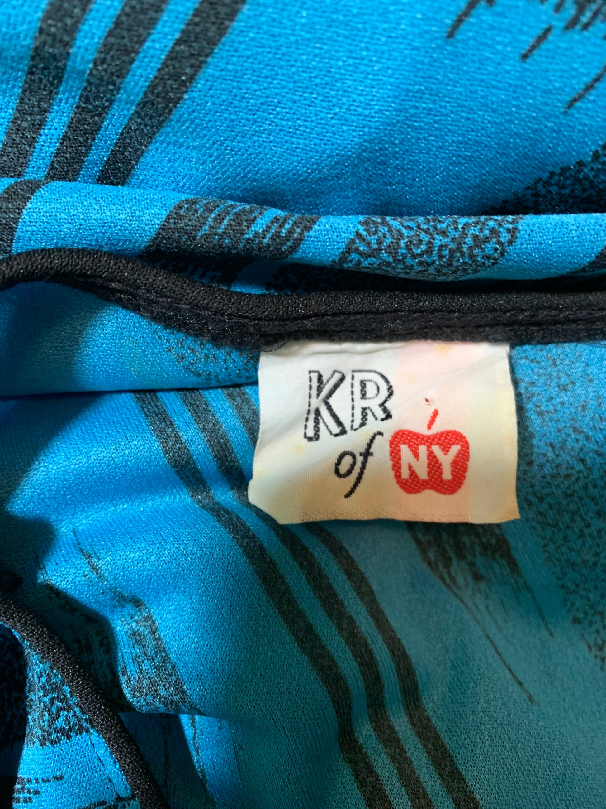 Black and turquoise southwestern inspired print 1980s nylon dress with three quarter length sleeves, elastic waist and button accents at shoulders. Unlined, no sash. By KR of NY, no flaws.