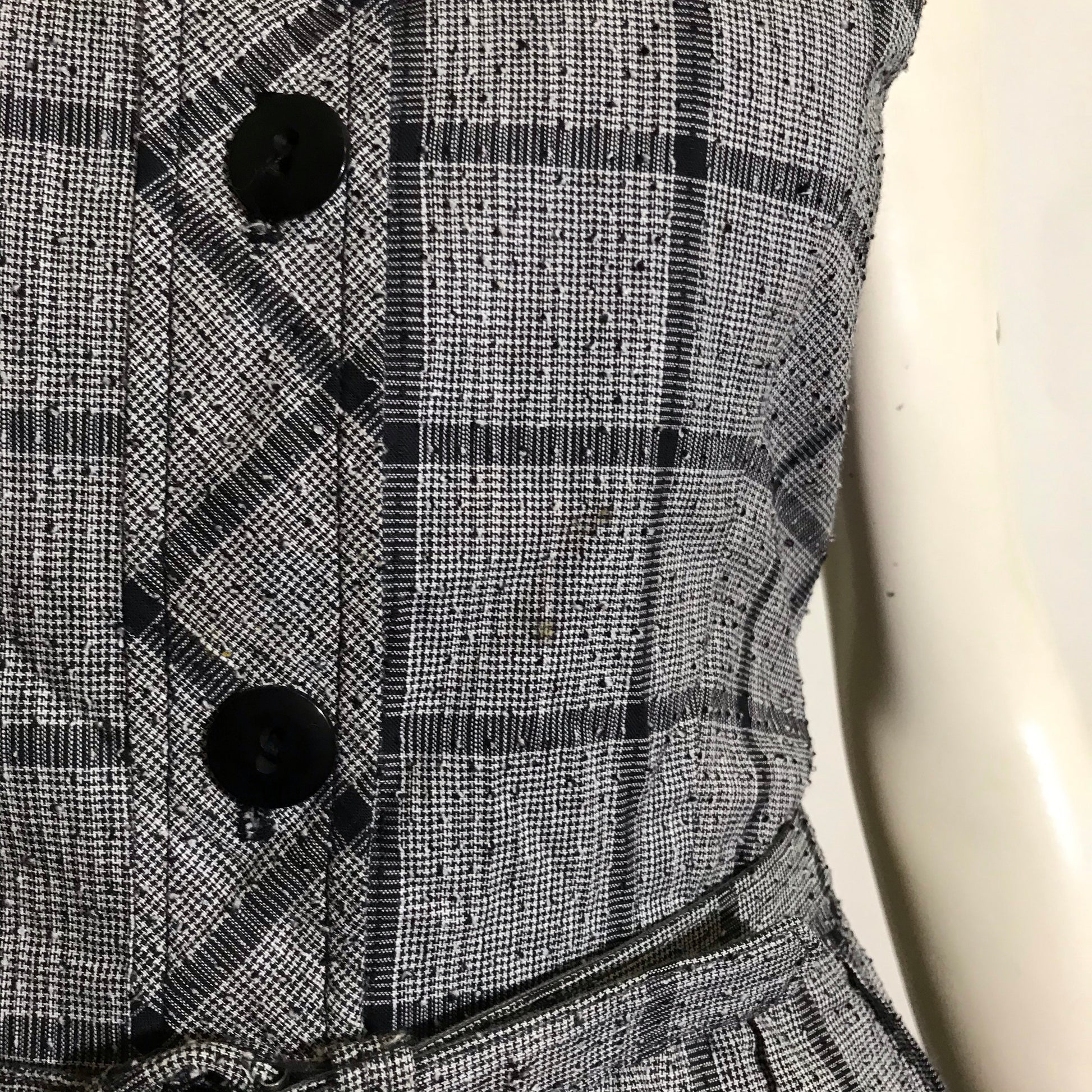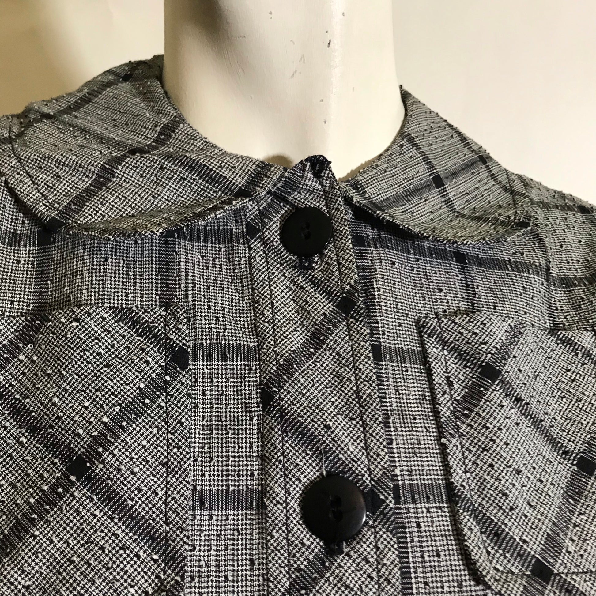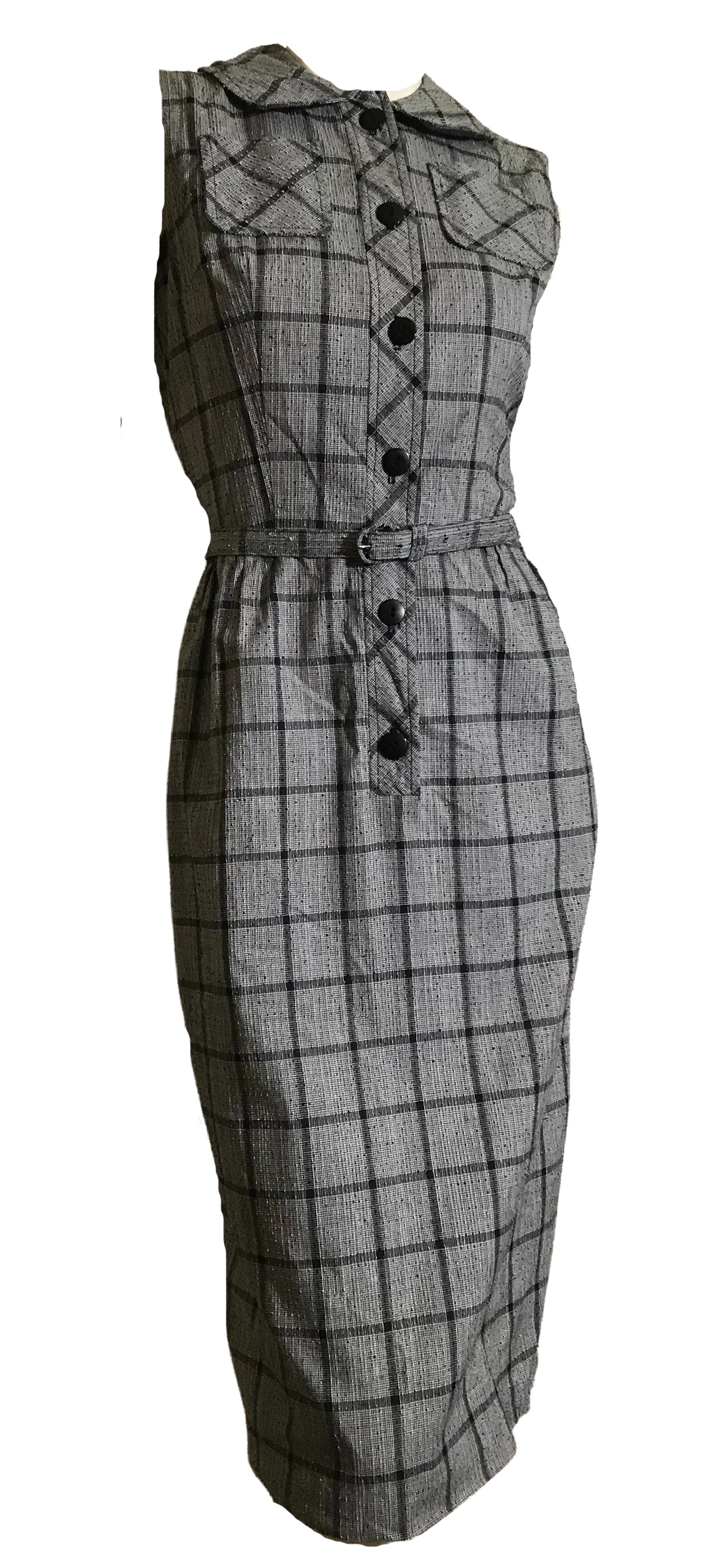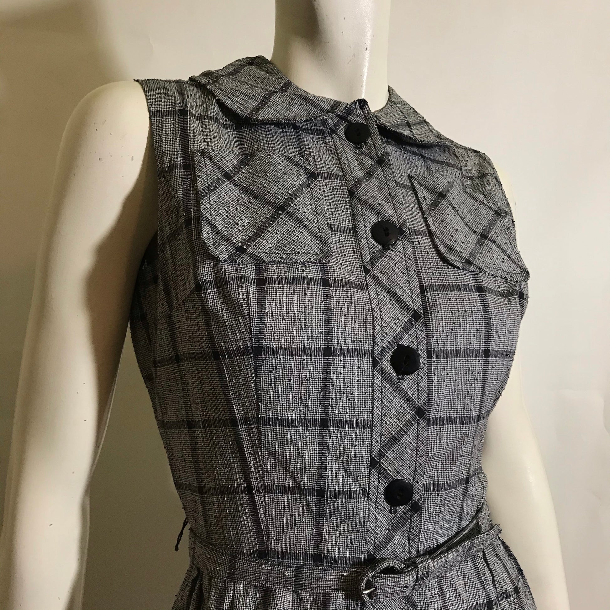 1950s handmade textured cotton weave checked dress in black and white with black buttons up front, rounded collar, self belt. Tiny spot on bodice as shown. No holes.
