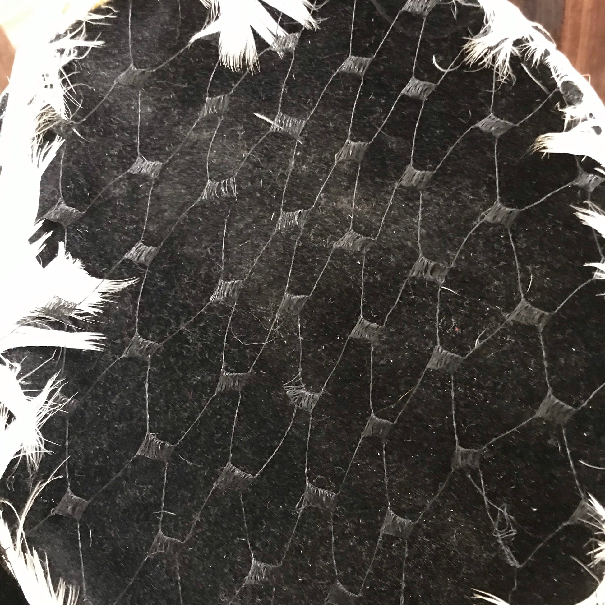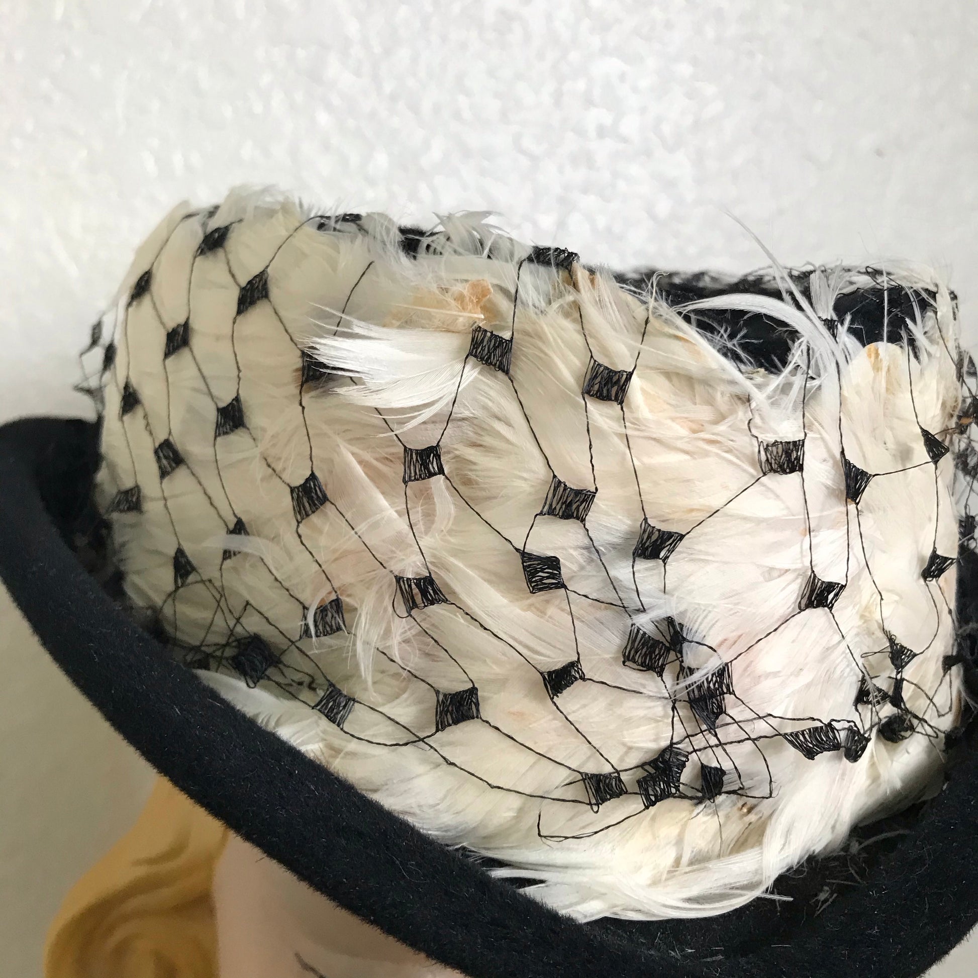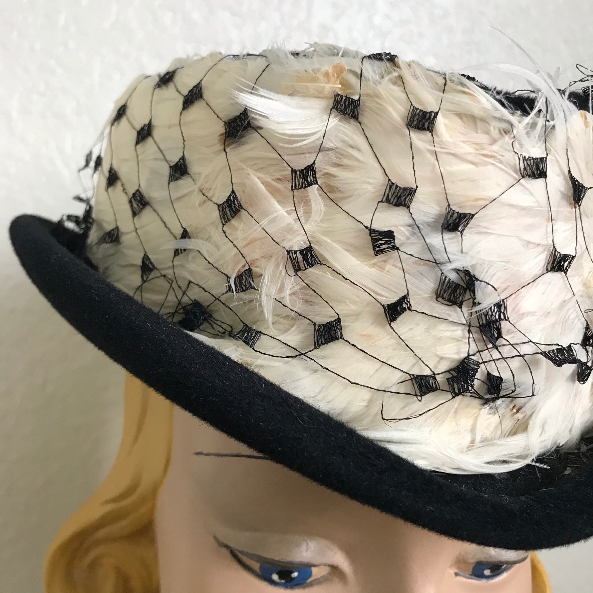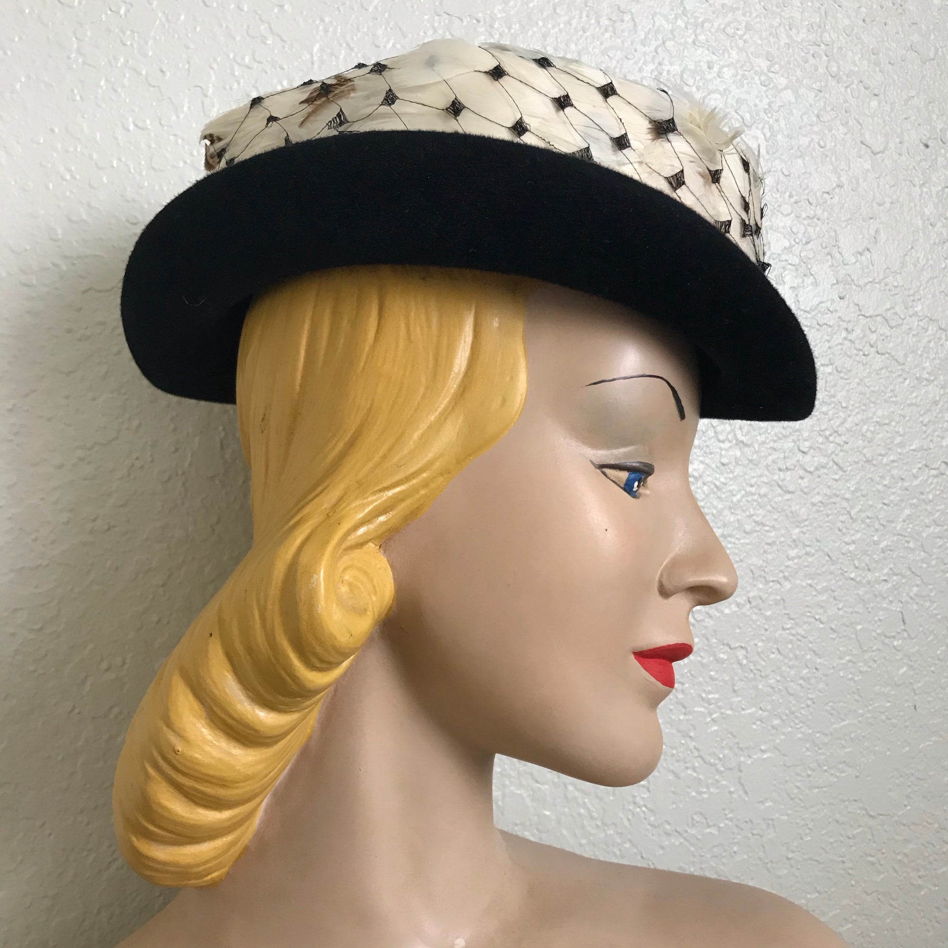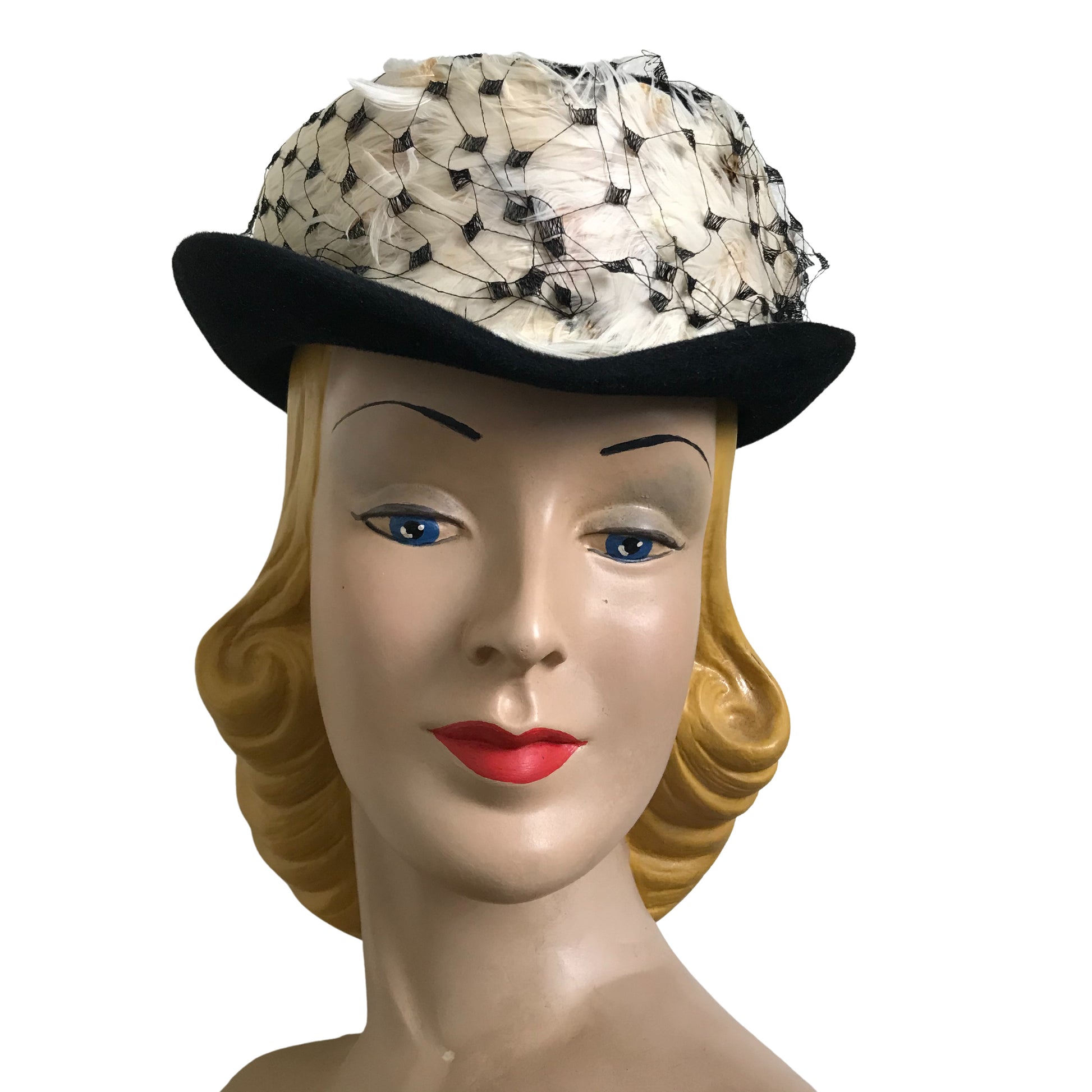Black felted wool boater style 1940s hat with slightly curved brim, netting around sides of crown holding white feathers. Veiling goes over top as well. Some yellowing to feathers, as is. Size 22 1/2
