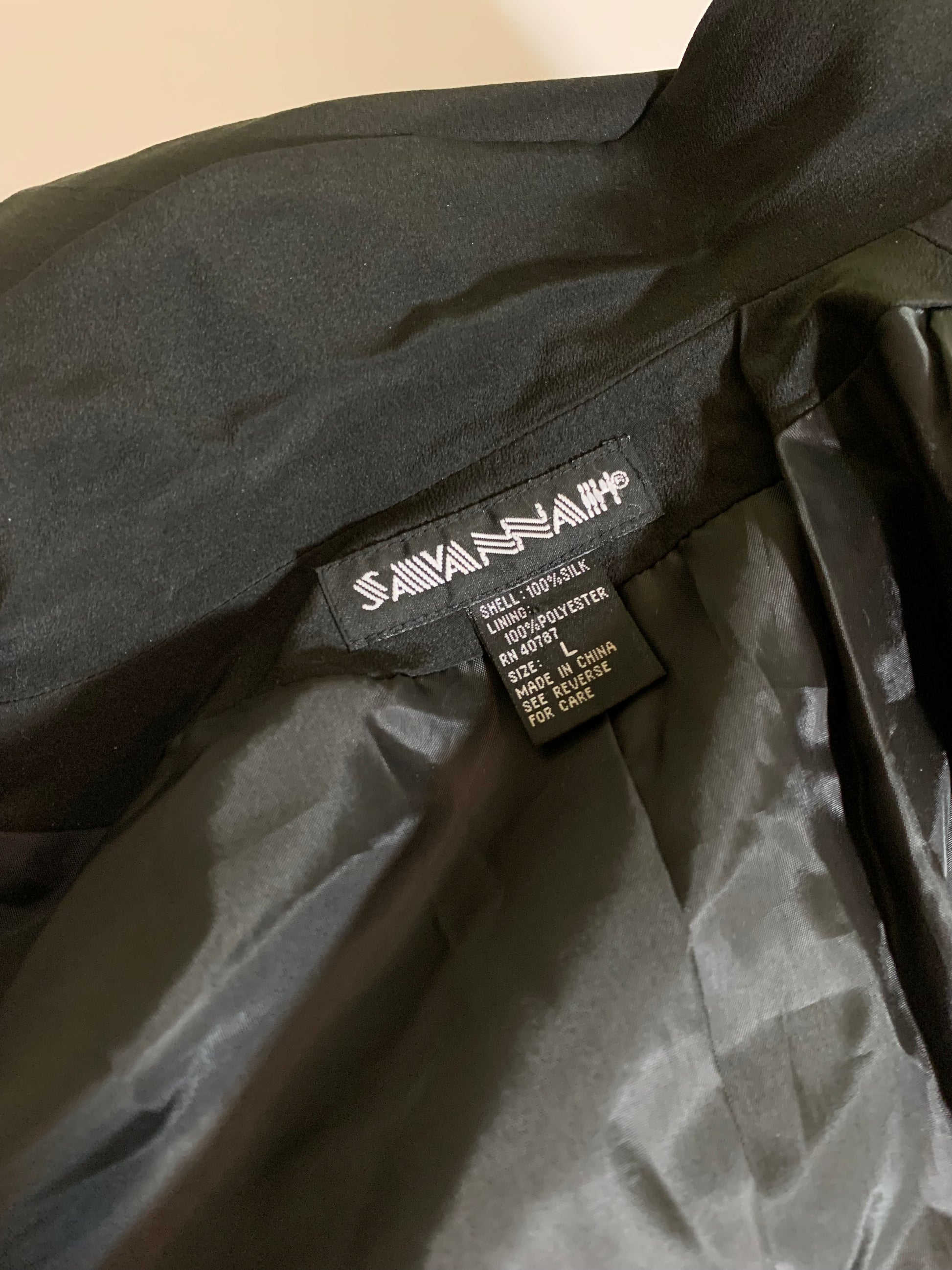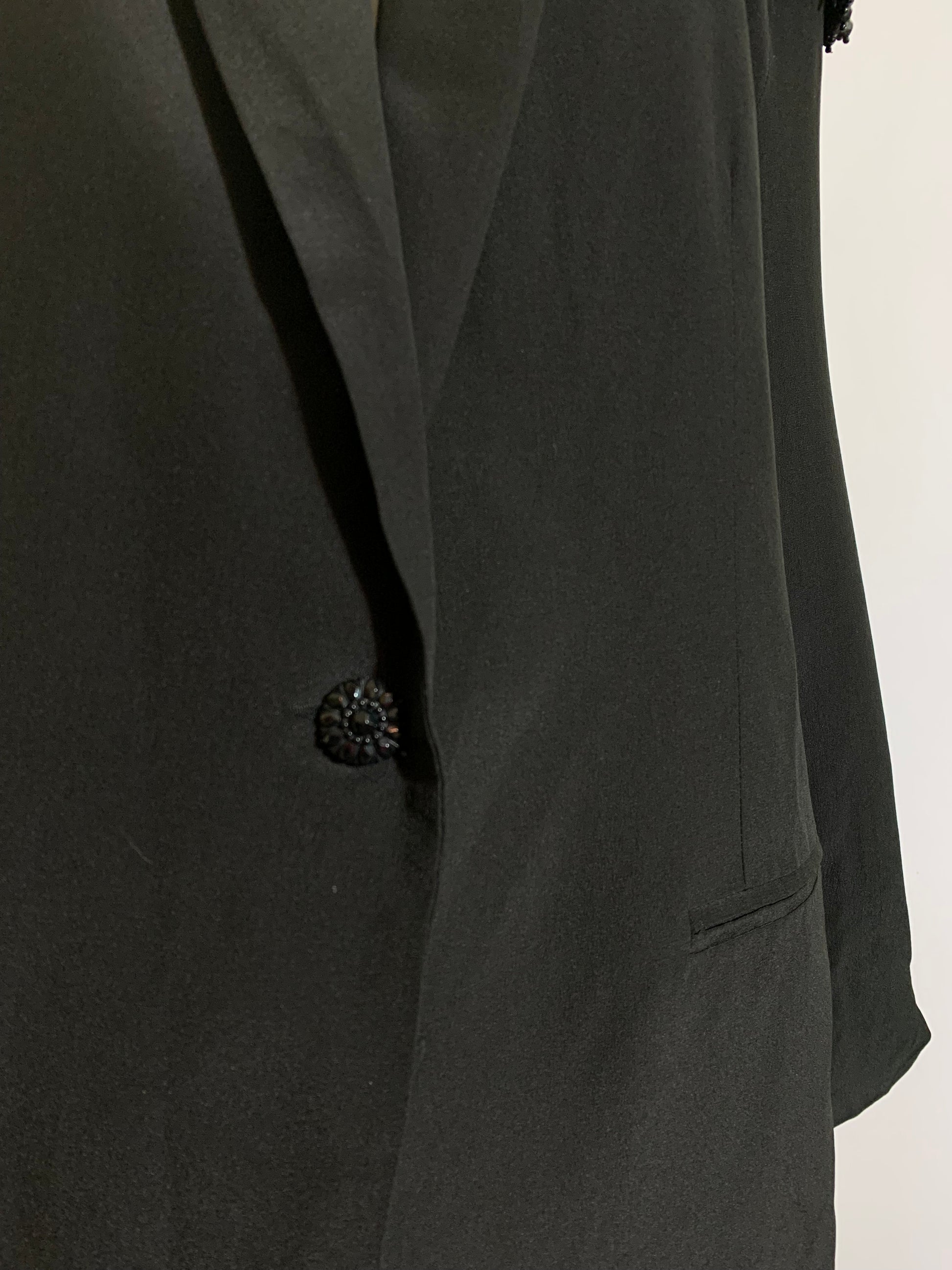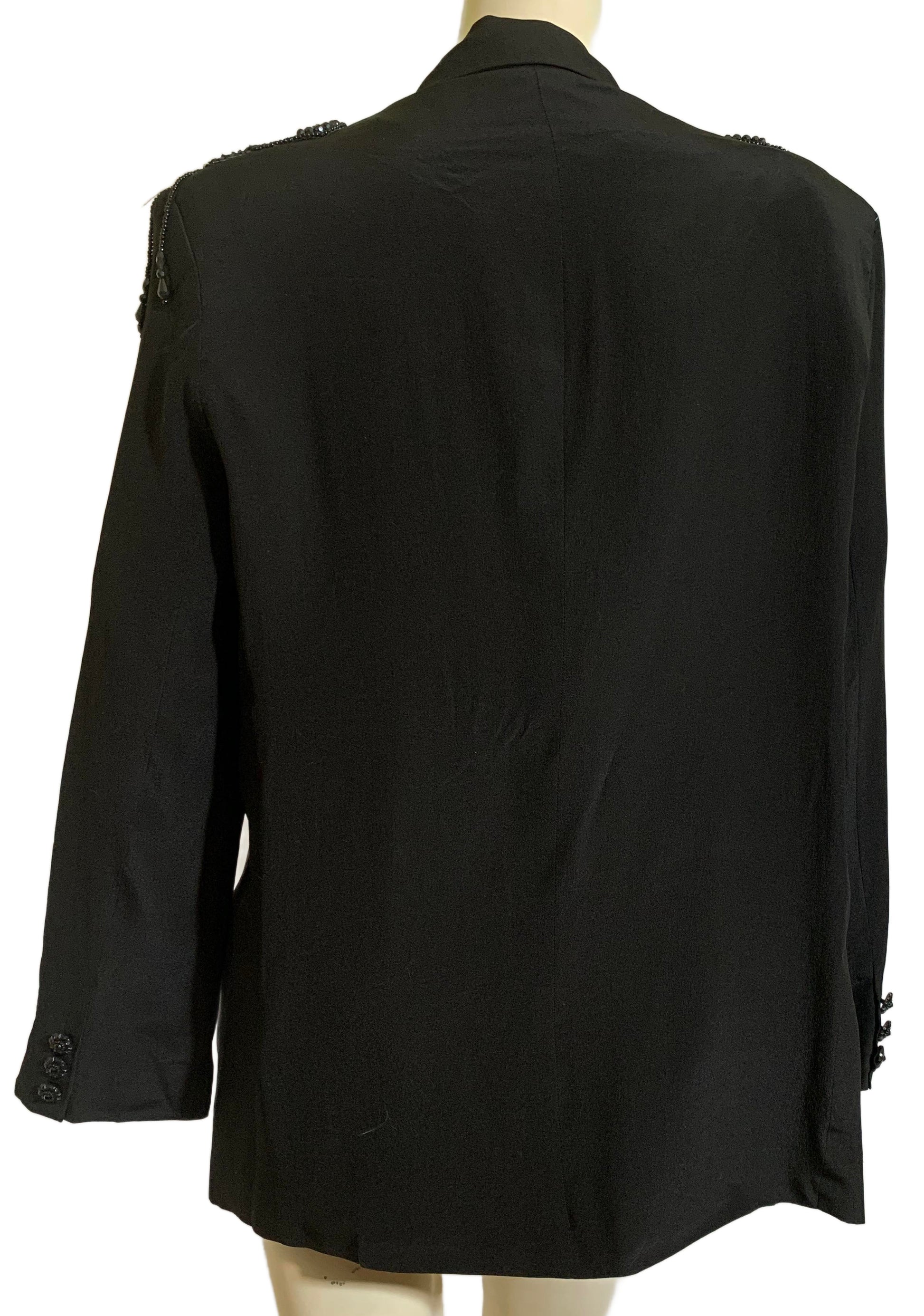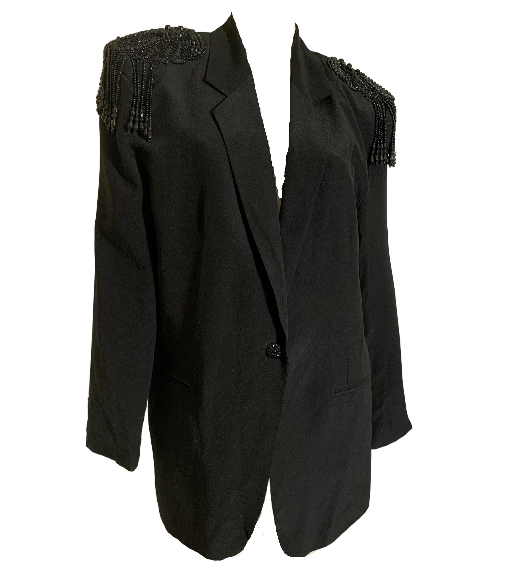 Iconic jet black boxy black oversized jacket with black beaded epaulets on each padded shoulder. One button at waist, lined. By Savannah, size L.
