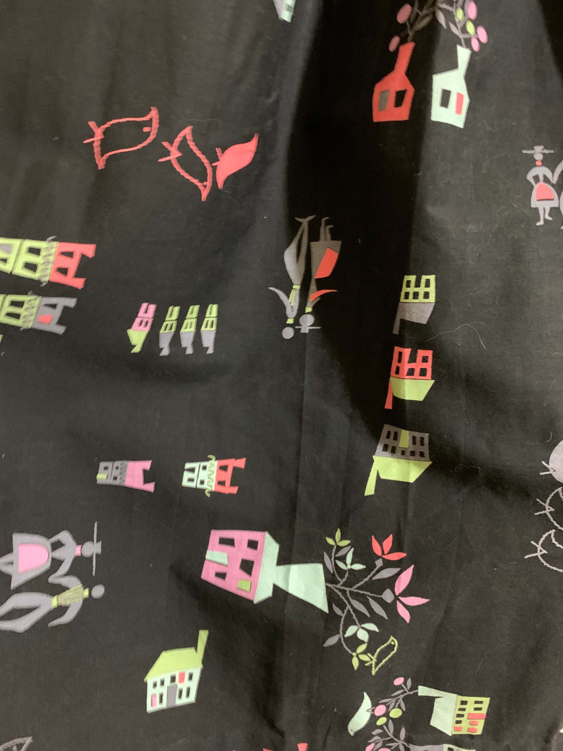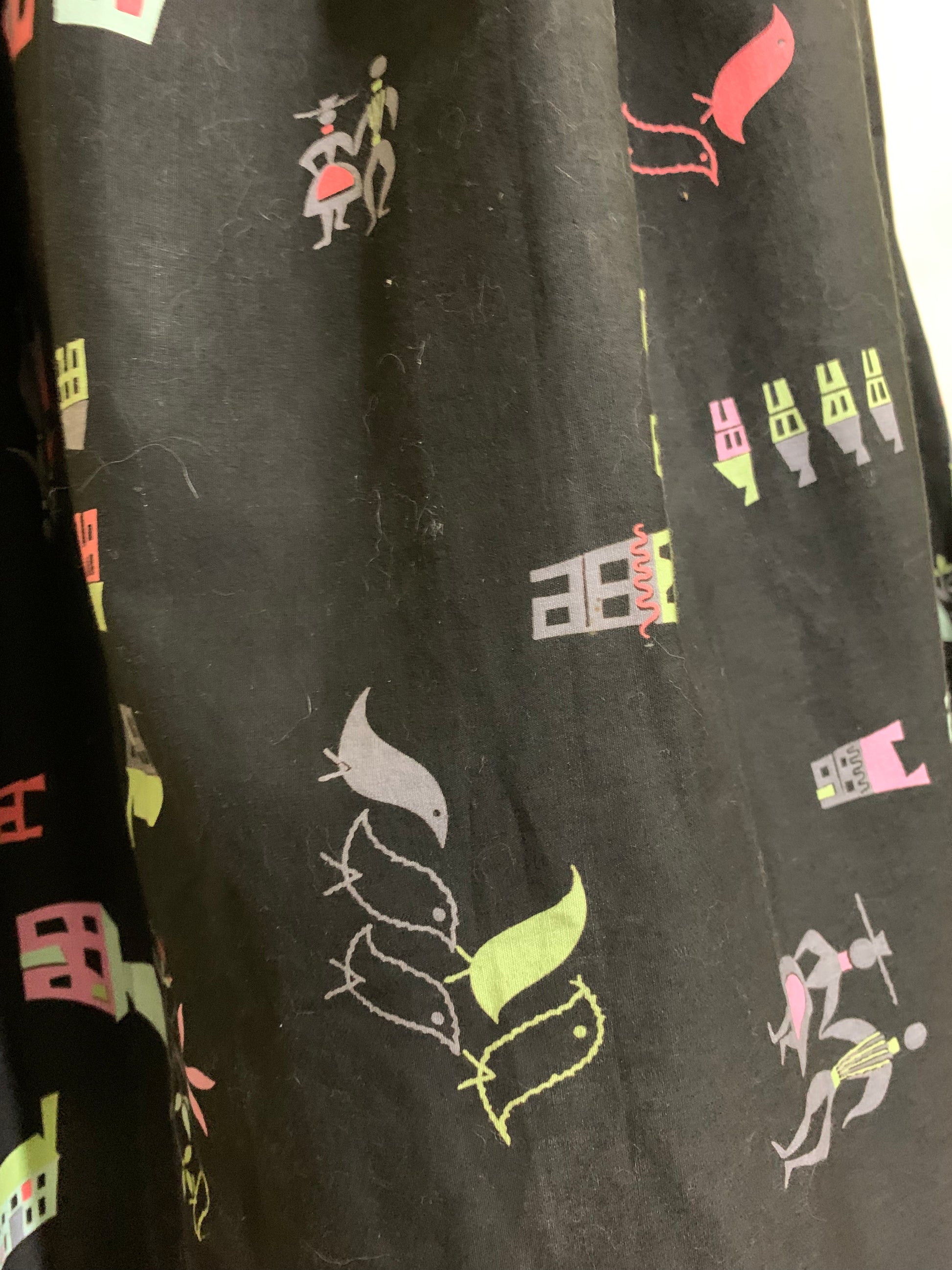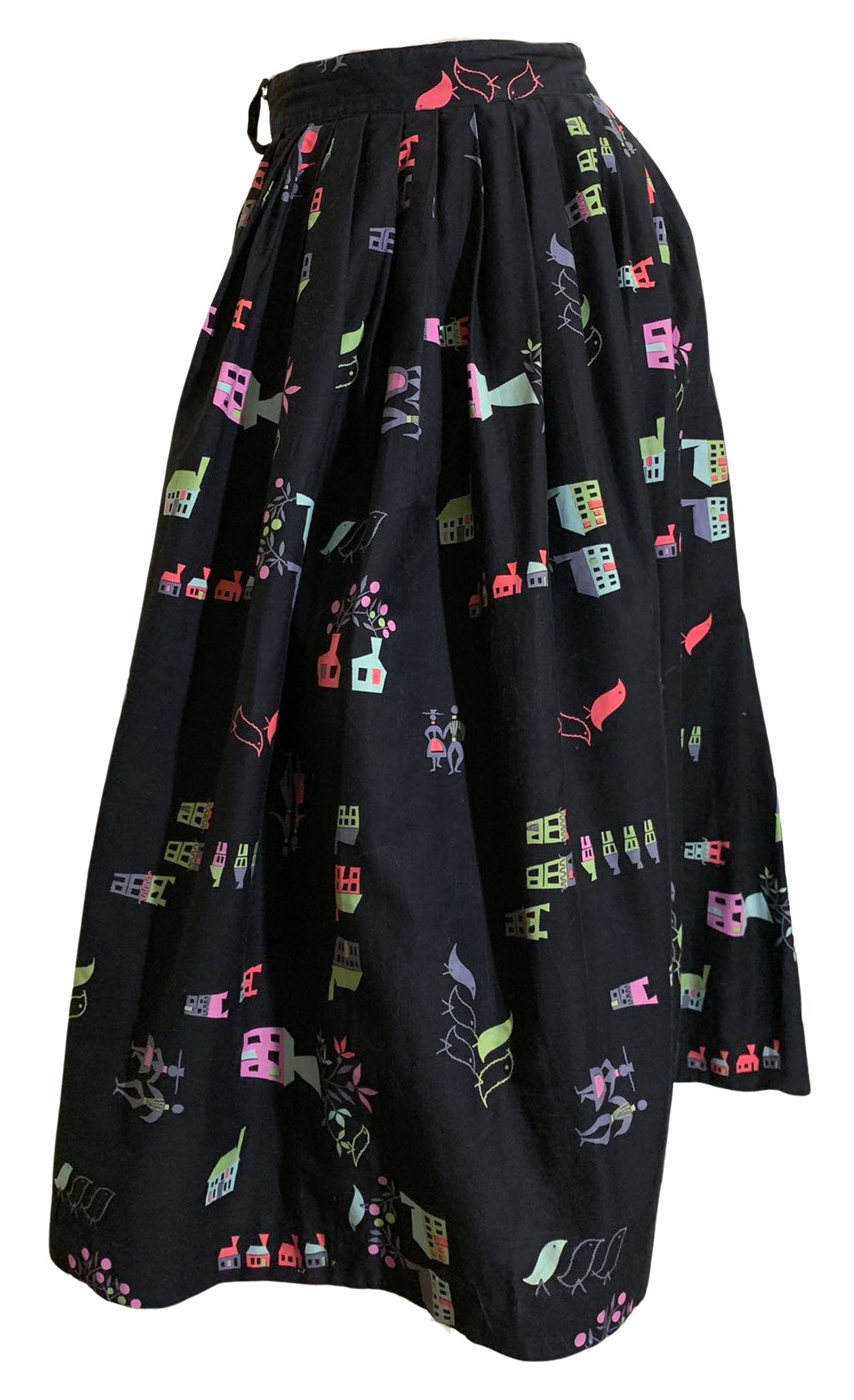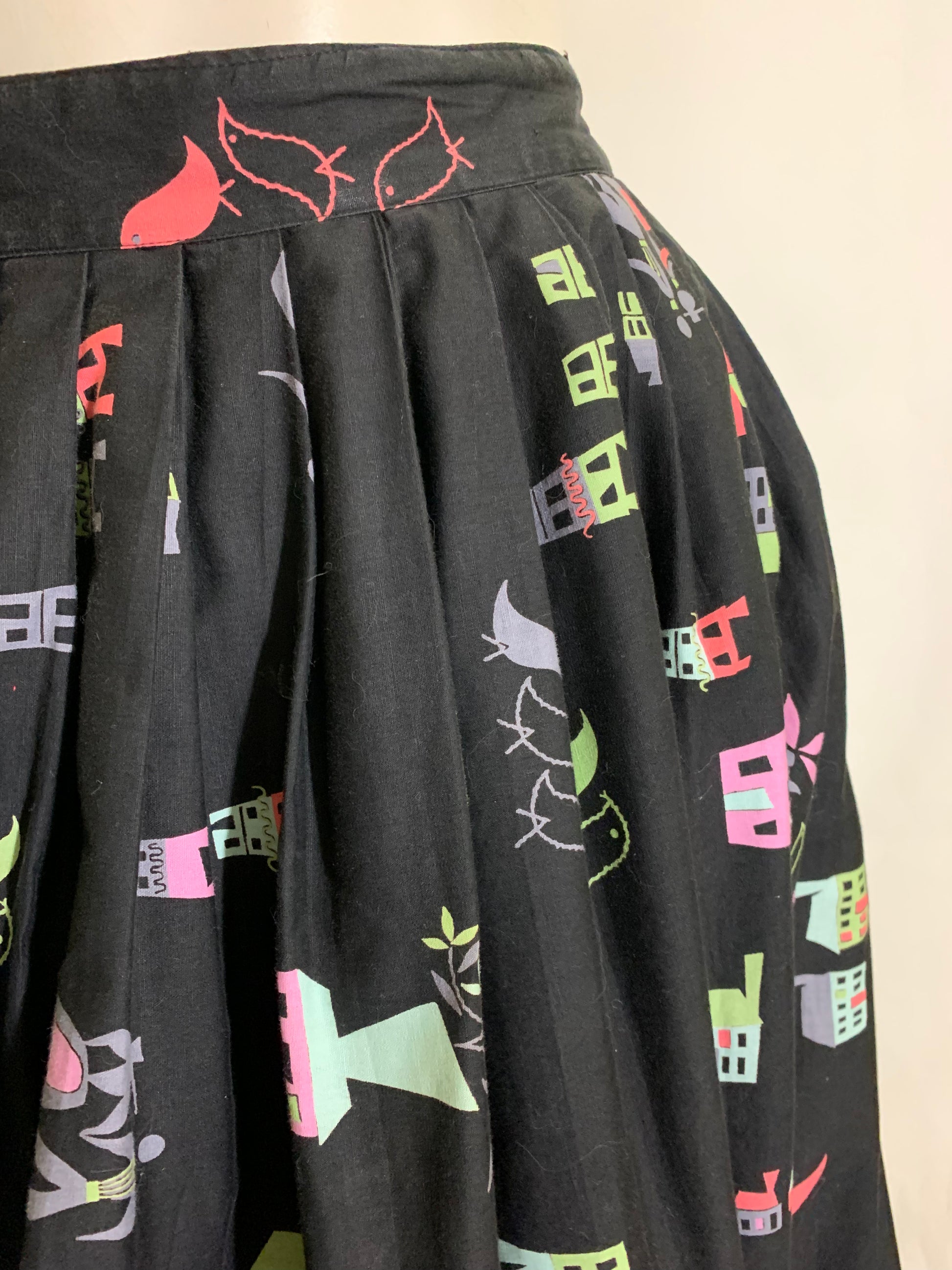 Fabulous 1950s black cotton super full skirt (not circle) with whimsical midcentury atomic print of plants, little people and birds attributed to American Artists Textiles. Side metal zipper and button. No flaws.